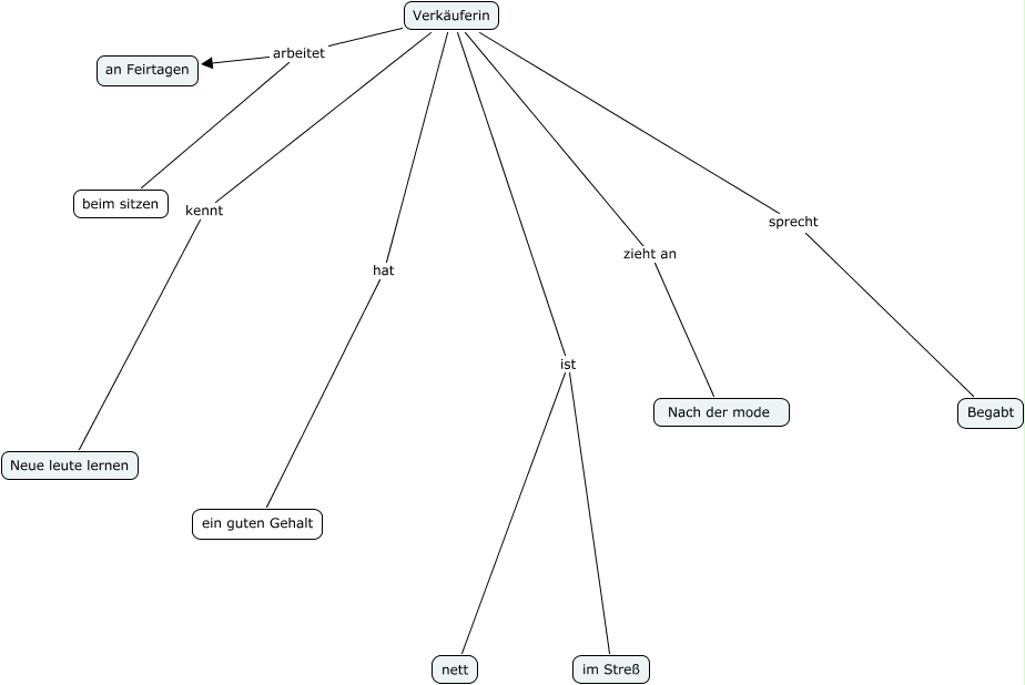 Questa Cmap, creata con IHMC CmapTools, contiene informazioni relative a: Verkäuferin, Verkäuferin zieht an Nach der mode, Verkäuferin kennt Neue leute lernen, Verkäuferin ist im Streß, Verkäuferin arbeitet an Feirtagen, Verkäuferin arbeitet beim sitzen, Verkäuferin hat ein guten Gehalt, Verkäuferin ist nett, Verkäuferin sprecht Begabt