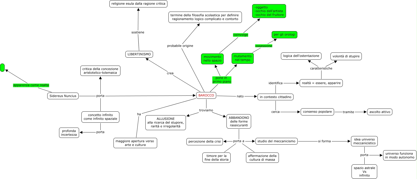 Questa Cmap, creata con IHMC CmapTools, contiene informazioni relative a: Mappa Barocco - Alberto Bonanomi, ABBANDONO delle forme rassicuranti porta a timore per la fine della storia, movimento nello spazio coinvolge -oggetto -occhio dell'artista -occhio del fruitore, realtà = essere, apparire caratteristiche volontà di stupire, Sidereus Nuncius porta concetto infinito come infinito spaziale, ABBANDONO delle forme rassicuranti porta a studio del meccanicismo, Sidereus Nuncius porta critica della concezione aristotelico-tolemaica, BAROCCO ha maggiore apertura verso arte e cultura, ABBANDONO delle forme rassicuranti porta a percezione della crisi, mutamento nel tempo ossessione per gli orologi, BAROCCO pone in primo piano mutamento nel tempo, studio del meccanicismo si forma idea universo meccanicistico, in contesto cittadino cerca consenso popolare, Sidereus Nuncius apparenza come realta, BAROCCO crea LIBERTINISMO, BAROCCO troviamo ABBANDONO delle forme rassicuranti, Sidereus Nuncius porta BAROCCO, ABBANDONO delle forme rassicuranti porta a affermazione della cultura di massa, BAROCCO pone in primo piano movimento nello spazio, BAROCCO troviamo ALLUSIONE alla ricerca del stupore, rarità e irregolarità, consenso popolare tramite ascolto attivo