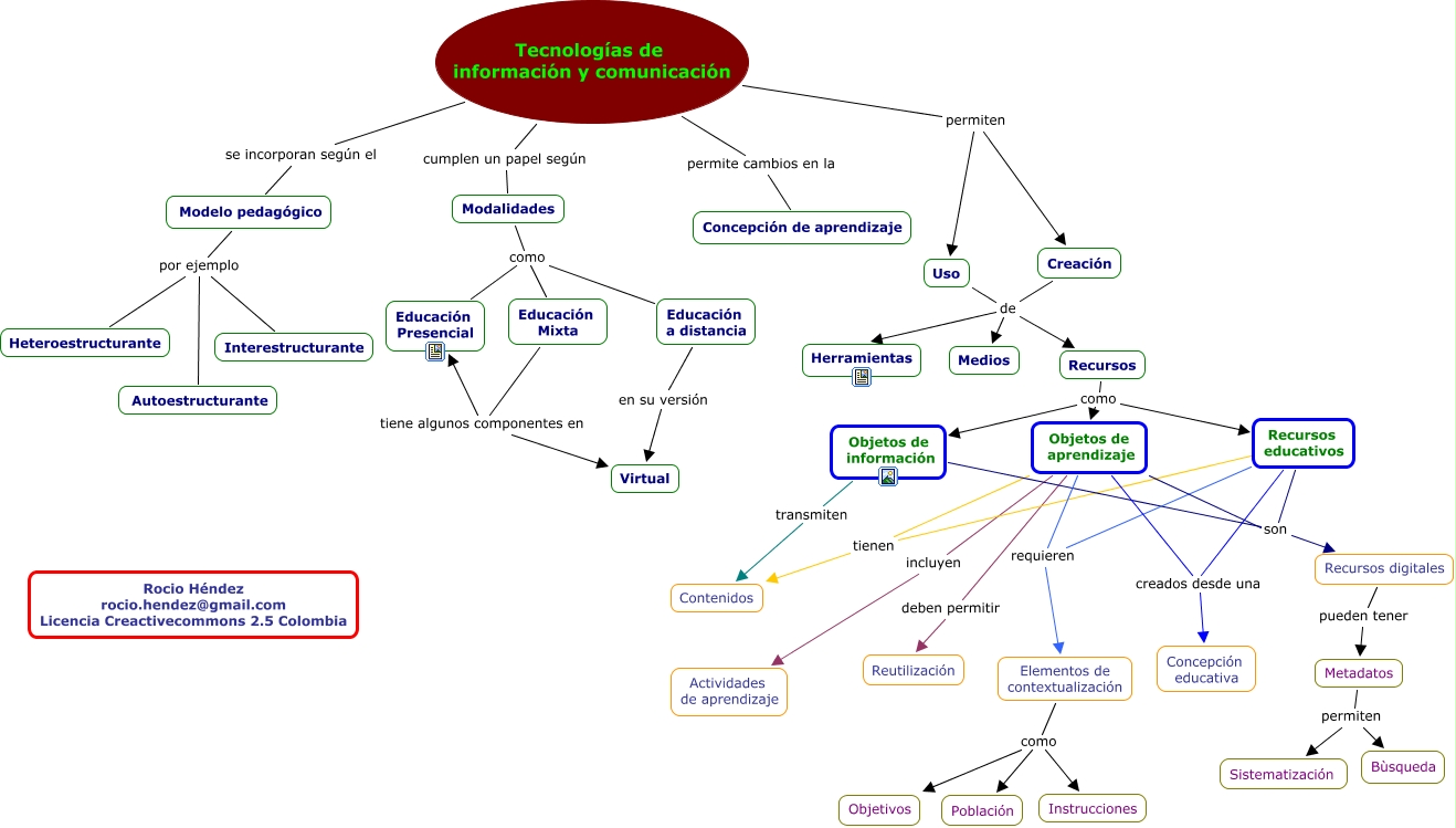 Este Cmap, tiene información relacionada con: objetos de aprendizaje, Recursos educativos requieren Elementos de contextualización, Elementos de contextualización como Instrucciones, Metadatos permiten Bùsqueda, Tecnologías de información y comunicación permiten Creación, Tecnologías de información y comunicación cumplen un papel según Modalidades, Objetos de aprendizaje tienen Contenidos, Modelo pedagógico por ejemplo Autoestructurante, Elementos de contextualización como Objetivos, Objetos de aprendizaje creados desde una Concepción educativa, Tecnologías de información y comunicación permiten Uso, Uso de Herramientas, Recursos educativos son Recursos digitales, Recursos como Recursos educativos, Recursos educativos creados desde una Concepción educativa, Creación de Recursos, Modalidades como Educación a distancia, Educación Mixta tiene algunos componentes en Educación Presencial, Objetos de aprendizaje incluyen Actividades de aprendizaje, Objetos de aprendizaje requieren Elementos de contextualización, Recursos como Objetos de aprendizaje