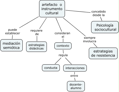 Este Cmap, tiene información relacionada con: Aguilar Tamayo 2010 artefacto cultural, artefacto o instrumento cultural puede establecer mediación semiótica, artefacto o instrumento cultural concebido desde la Psicología sociocultural, interacciones entre docente- alumno, artefacto o instrumento cultural siempre involucra estrategias de resistencia, contexto regula interacciones, artefacto o instrumento cultural requiere de estrategias didácticas, artefacto o instrumento cultural consideran el contexto, contexto regula conducta