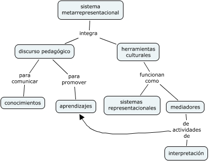 Este Cmap, tiene información relacionada con: Aguilar Tamayo 2010 Sistema metarrepresentacional, mediadores de actividades de interpretación, discurso pedagógico para comunicar conocimientos, herramientas culturales funcionan como sistemas representacionales, sistema metarrepresentacional integra herramientas culturales, sistema metarrepresentacional integra discurso pedagógico, discurso pedagógico para promover aprendizajes, herramientas culturales funcionan como mediadores, mediadores de actividades de aprendizajes