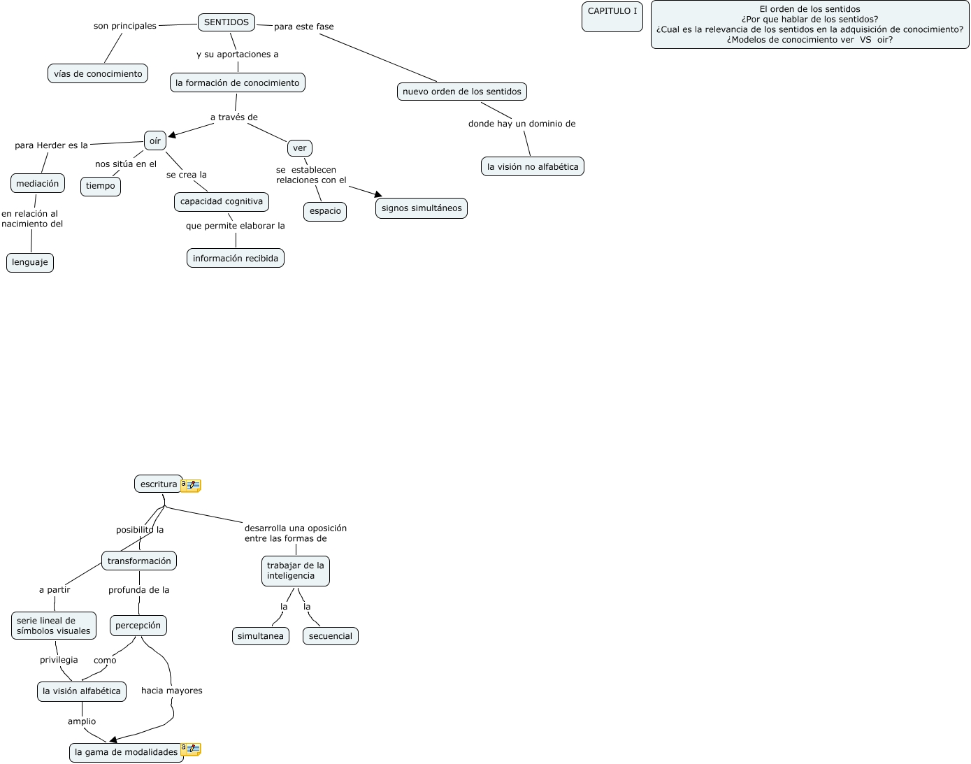 Este Cmap, tiene información relacionada con: CAPITULO 1 TERCERA FASE, oír se crea la capacidad cognitiva, percepción como la visión alfabética, ver se establecen relaciones con el signos simultáneos, ver se establecen relaciones con el espacio, la formación de conocimiento a través de ver, la formación de conocimiento a través de oír, trabajar de la inteligencia la simultanea, oír nos sitúa en el tiempo, escritura a partir serie lineal de símbolos visuales, percepción hacia mayores la gama de modalidades, oír para Herder es la mediación, SENTIDOS y su aportaciones a la formación de conocimiento, escritura desarrolla una oposición entre las formas de trabajar de la inteligencia, mediación en relación al nacimiento del lenguaje, escritura posibilito la transformación, trabajar de la inteligencia la secuencial, capacidad cognitiva que permite elaborar la información recibida, SENTIDOS son principales vías de conocimiento, transformación profunda de la percepción, la visión alfabética amplio la gama de modalidades