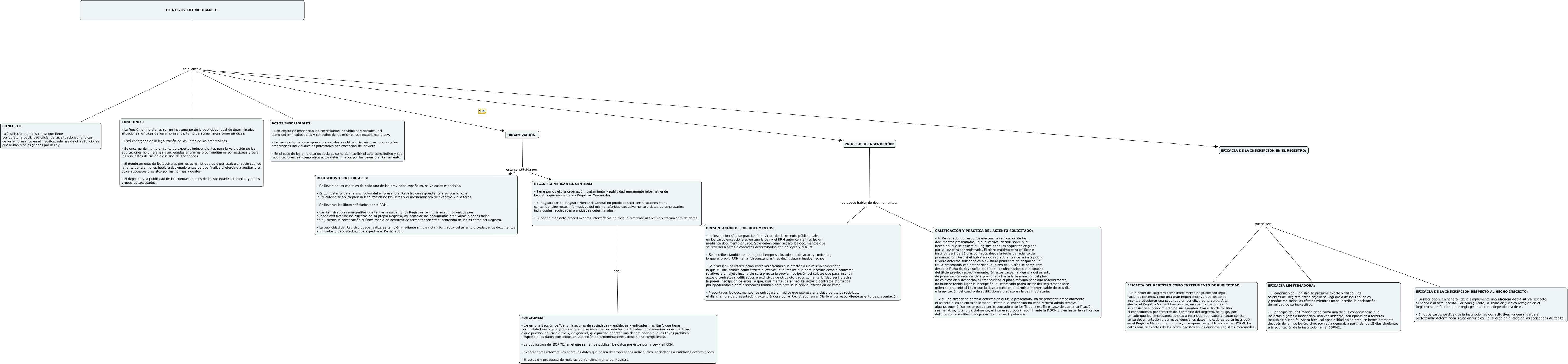 Este Cmap, tiene información relacionada con: Amb el Registre hem topat, EL REGISTRO MERCANTIL en cuanto a EFICACIA DE LA INSCRIPCIÓN EN EL REGISTRO:, REGISTRO MERCANTIL CENTRAL: - Tiene por objeto la ordenación, tratamiento y publicidad meramente informativa de los datos que reciba de los Registros Mercantiles. - El Registrador del Registro Mercantil Central no puede expedir certificaciones de su contenido, sino notas informativas del mismo referidas exclusivamente a datos de empresarios individuales, sociedades o entidades determinadas. - Funciona mediante procedimientos informáticos en todo lo referente al archivo y tratamiento de datos. son: FUNCIONES: - Llevar una Sección de "denominaciones de sociedades y entidades y entidades inscritas", que tiene por finalidad esencial el procurar que no se inscriban sociedades o entidades con denominaciones idénticas o que puedan inducir a error y, en general, que puedan adoptar una denominación que las Leyes prohíben. Respecto a los datos contenidos en la Sección de denominaciones, tiene plena competencia. - La publicación del BORME, en el que se han de publicar los datos previstos por la Ley y el RRM. - Expedir notas informativas sobre los datos que posea de empresarios individuales, sociedades o entidades determinadas. - El estudio y propuesta de mejoras del funcionamiento del Registro., ORGANIZACIÓN: está constituida por: REGISTRO MERCANTIL CENTRAL: - Tiene por objeto la ordenación, tratamiento y publicidad meramente informativa de los datos que reciba de los Registros Mercantiles. - El Registrador del Registro Mercantil Central no puede expedir certificaciones de su contenido, sino notas informativas del mismo referidas exclusivamente a datos de empresarios individuales, sociedades o entidades determinadas. - Funciona mediante procedimientos informáticos en todo lo referente al archivo y tratamiento de datos., EFICACIA DE LA INSCRIPCIÓN EN EL REGISTRO: puede ser: EFICACIA LEGITIMADORA: - El contenido del Registro se presume exacto y válido. Los asientos del Registro están bajo la salvaguardia de los Tribunales y producirán todos los efectos mientras no se inscriba la declaración de nulidad de su inexactitud. - El principio de legitimación tiene como una de sus consecuencias que los actos sujetos a inscripción, una vez inscritos, son oponibles a terceros incluso de buena fe. Ahora bien, tal oponibilidad no se produce inmediatamente después de la inscripción, sino, por regla general, a partir de los 15 días siguientes a la publicación de la inscripción en el BORME., PROCESO DE INSCRIPCIÓN: se puede hablar de dos momentos: CALIFICACIÓN Y PRÁCTICA DEL ASIENTO SOLICITADO: - Al Registrador corresponde efectuar la calificación de los documentos presentados, lo que implica, decidir sobre si el hecho del que se solicita el Registro tiene los requisitos exigidos por la Ley para ser registrado. El plazo máximo para calificar e inscribir será de 15 días contados desde la fecha del asiento de presentación. Pero si el hubiera sido retirado antes de la inscripción, tuviera defectos subsanables o existiera pendiente de despacho un título presentado con anterioridad, el plazo de 15 días se computará desde la fecha de devolución del título, la subsanación o el despacho del título previo, respectivamente. En estos casos, la vigencia del asiento de presentación se entenderá prorrogada hasta la terminación del plazo de calificación y despacho. Si transcurrido el plazo máximo señalado anteriormente, no hubiere tenido lugar la inscripción, el interesado podrá instar del Registrador ante quien se presentó el título que la lleve a cabo en el término improrrogable de tres días o la aplicación del cuadro de sustituciones previsto en la Ley Hipotecaria. - Si el Registrador no aprecia defectos en el título presentado, ha de practicar inmediatamente el asiento o los asientos solicitados. Frente a la inscripción no cabe recurso administrativo alguno, pues únicamente puede ser impugnado ante los Tribunales. En el caso de que la calificación sea negativa, total o parcialmente, el interesado podrá recurrir ante la DGRN o bien instar la calificación del cuadro de sustituciones previsto en la Ley Hipotecaria., PROCESO DE INSCRIPCIÓN: se puede hablar de dos momentos: PRESENTACIÓN DE LOS DOCUMENTOS: - La inscripción sólo se practicará en virtud de documento público, salvo en los casos excepcionales en que la Ley y el RRM autoricen la inscripción mediante documento privado. Sólo deben tener acceso los documentos que se refieran a actos o contratos determinados por las leyes y el RRM. - Se inscriben también en la hoja del empresario, además de actos y contratos, lo que el propio RRM llama "circunstancias", es decir, determinados hechos. - Se produce una interrelación entre los asientos que afecten a un mismo empresario, lo que el RRM califica como "tracto sucesivo", que implica que para inscribir actos o contratos relativos a un sijeto inscribible será precisa la previa inscripción del sujeto; que para inscribir actos o contratos modificativos o extintivos de otros otorgados con anterioridad será precisa la previa inscripción de éstos; y que, igualmente, para inscribir actos o contratos otorgados por apoderados o administradores también será precisa la previa inscripción de éstos. - Presentados los documentos, se entregará un recibo que expresará la clase de títulos recibidos, el día y la hora de presentación, extendiéndose por el Registrador en el Diario el correspondiente asiento de presentación., EL REGISTRO MERCANTIL en cuanto a PROCESO DE INSCRIPCIÓN:, ORGANIZACIÓN: está constituida por: REGISTROS TERRITORIALES: - Se llevan en las capitales de cada una de las provincias españolas, salvo casos especiales. - Es competente para la inscripción del empresario el Registro correspondiente a su domicilio, e igual criterio se aplica para la legalización de los libros y el nombramiento de exp
