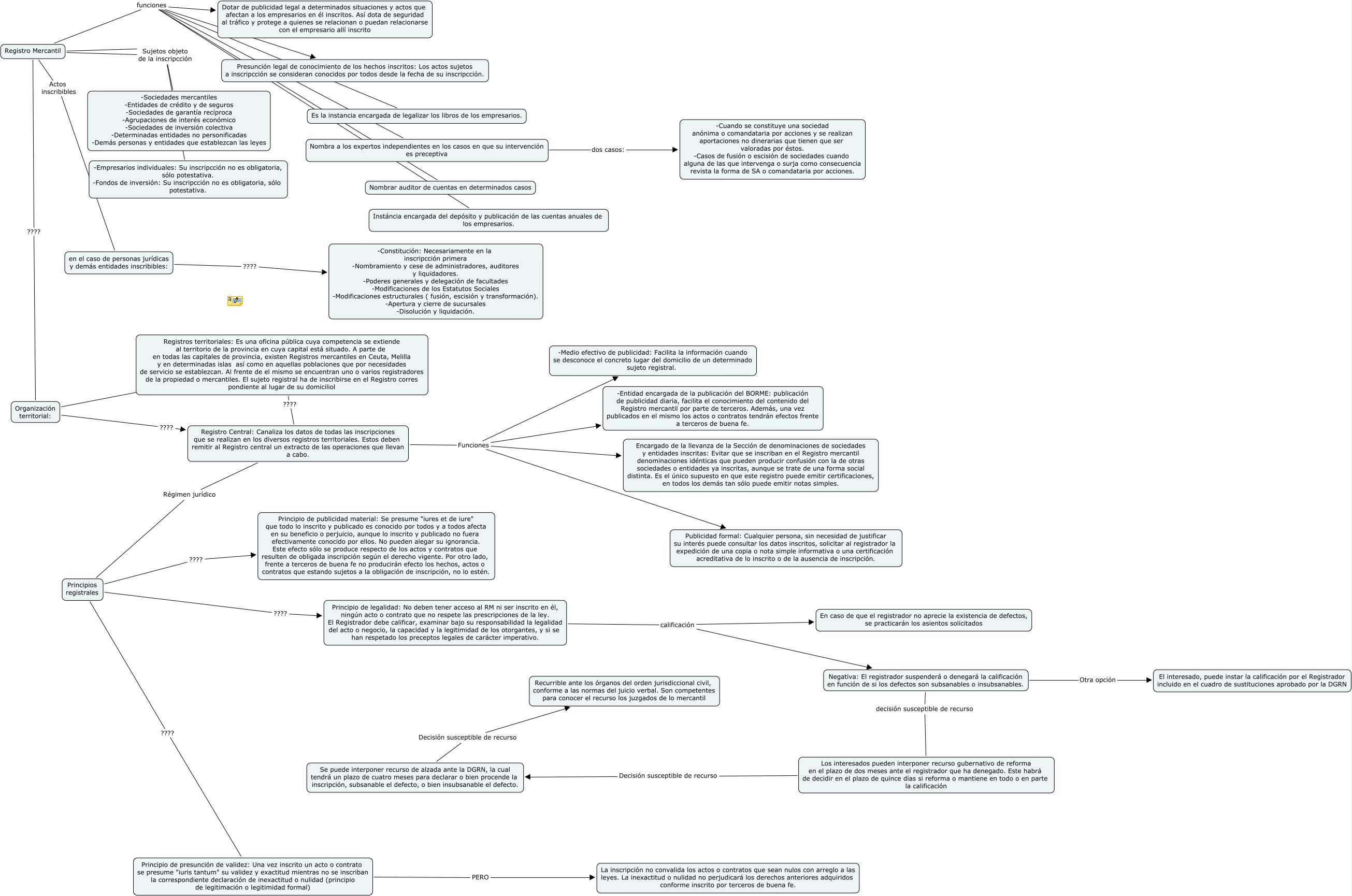 Este Cmap, tiene información relacionada con: Registro mercantil, Registro Mercantil Sujetos objeto de la inscripcción -Sociedades mercantiles -Entidades de crédito y de seguros -Sociedades de garantía recíproca -Agrupaciones de interés económico -Sociedades de inversión colectiva -Determinadas entidades no personificadas -Demás personas y entidades que establezcan las leyes, Principios registrales ???? Principio de publicidad material: Se presume "iures et de iure" que todo lo inscrito y publicado es conocido por todos y a todos afecta en su beneficio o perjuicio, aunque lo inscrito y publicado no fuera efectivamente conocido por ellos. No pueden alegar su ignorancia. Este efecto sólo se produce respecto de los actos y contratos que resulten de obligada inscripción según el derecho vigente. Por otro lado, frente a terceros de buena fe no producirán efecto los hechos, actos o contratos que estando sujetos a la obligación de inscripción, no lo estén., Negativa: El registrador suspenderá o denegará la calificación en función de si los defectos son subsanables o insubsanables. decisión susceptible de recurso Los interesados pueden interponer recurso gubernativo de reforma en el plazo de dos meses ante el registrador que ha denegado. Este habrá de decidir en el plazo de quince días si reforma o mantiene en todo o en parte la calificación, Principio de legalidad: No deben tener acceso al RM ni ser inscrito en él, ningún acto o contrato que no respete las prescripciones de la ley. El Registrador debe calificar, examinar bajo su responsabilidad la legalidad del acto o negocio, la capacidad y la legitimidad de los otorgantes, y si se han respetado los preceptos legales de carácter imperativo. calificación Negativa: El registrador suspenderá o denegará la calificación en función de si los defectos son subsanables o insubsanables., en el caso de personas jurídicas y demás entidades inscribibles: ???? -Constitución: Necesariamente en la inscripcción primera -Nombramiento y cese de administradores, auditores y liquidadores. -Poderes generales y delegación de facultades -Modificaciones de los Estatutos Sociales -Modificaciones estructurales ( fusión, escisión y transformación). -Apertura y cierre de sucursales -Disolución y liquidación., Registro Central: Canaliza los datos de todas las inscripciones que se realizan en los diversos registros territoriales. Estos deben remitir al Registro central un extracto de las operaciones que llevan a cabo. Régimen jurídico Principios registrales, Registro Mercantil funciones Nombrar auditor de cuentas en determinados casos, Principios registrales ???? Principio de presunción de validez: Una vez inscrito un acto o contrato se presume "iuris tantum" su validez y exactitud mientras no se inscriban la correspondiente declaración de inexactitud o nulidad (principio de legitimación o legitimidad formal), Registro Central: Canaliza los datos de todas las inscripciones que se realizan en los diversos registros territoriales. Estos deben remitir al Registro central un extracto de las operaciones que llevan a cabo. Funciones Encargado de la llevanza de la Sección de denominaciones de sociedades y entidades inscritas: Evitar que se inscriban en el Registro mercantil denominaciones idénticas que pueden producir confusión con la de otras sociedades o entidades ya inscritas, aunque se trate de una forma social distinta. Es el único supuesto en que este registro puede emitir certificaciones, en todos los demás tan sólo puede emitir notas simples., Registro Mercantil funciones Es la instancia encargada de legalizar los libros de los empresarios., Principio de legalidad: No deben tener acceso al RM ni ser inscrito en él, ningún acto o contrato que no respete las prescripciones de la ley. El Registrador debe calificar, examinar bajo su responsabilidad la legalidad del acto o negocio, la capacidad y la legitimidad de los otorgantes, y si se han respetado los preceptos legales de carácter imperativo. calificación En caso de que el registrador no aprecie la existencia de defectos, se practicarán los asientos solicitados, Registro Mercantil funciones Nombra a los expertos independientes en los casos en que su intervención es preceptiva, Registro Mercantil Sujetos objeto de la inscripcción -Sociedades mercantiles -Entidades de crédito y de seguros -Sociedades de garantía recíproca -Agrupaciones de interés económico -Sociedades de inversión colectiva -Determinadas entidades no personificadas -Demás personas y entidades que establezcan las leyes, Negativa: El registrador suspenderá o denegará la calificación en función de si los defectos son subsanables o insubsanables. Otra opción El interesado, puede instar la calificación por el Registrador incluido en el cuadro de sustituciones aprobado por la DGRN, Registro Central: Canaliza los datos de todas las inscripciones que se realizan en los diversos registros territoriales. Estos deben remitir al Registro central un extracto de las operaciones que llevan a cabo. Funciones Publicidad formal: Cualquier persona, sin necesidad de justificar su interés puede consultar los datos inscritos, solicitar al registrador la expedición de una copia o nota simple informativa o una certificación acreditativa de lo inscrito o de la ausencia de inscripción., Registro Mercantil Actos inscribibles en el caso de personas jurídicas y demás entidades inscribibles:, Organización territorial: ???? Registro Central: Canaliza los datos de todas las inscripciones que se realizan en los diversos registros territoriales. Estos deben remitir al Registro central un extracto de las operaciones que llevan a cabo., Nombra a los expertos independientes en los casos en que su intervención es preceptiva dos casos: -Cuando se constituye una sociedad anónima o comandataria por acciones y se realizan aportaciones no dinerarias que tienen que ser valoradas por éstos. -Casos de fusión o escisión d