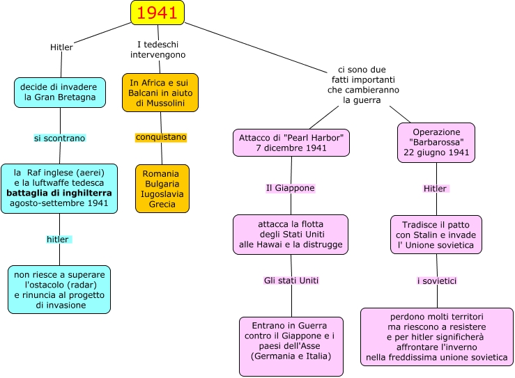 Questa Cmap, creata con IHMC CmapTools, contiene informazioni relative a: Seconda guerra mondiale II parte (s.m), Tradisce il patto con Stalin e invade l' Unione sovietica i sovietici perdono molti territori ma riescono a resistere e per hitler significherà affrontare l'inverno nella freddissima unione sovietica, In Africa e sui Balcani in aiuto di Mussolini conquistano Romania Bulgaria Iugoslavia Grecia, 1941 Hitler decide di invadere la Gran Bretagna, Operazione "Barbarossa" 22 giugno 1941 Hitler Tradisce il patto con Stalin e invade l' Unione sovietica, 1941 ci sono due fatti importanti che cambieranno la guerra Attacco di "Pearl Harbor" 7 dicembre 1941, Attacco di "Pearl Harbor" 7 dicembre 1941 Il Giappone attacca la flotta degli Stati Uniti alle Hawai e la distrugge, attacca la flotta degli Stati Uniti alle Hawai e la distrugge Gli stati Uniti Entrano in Guerra contro il Giappone e i paesi dell'Asse (Germania e Italia), decide di invadere la Gran Bretagna si scontrano la Raf inglese (aerei) e la luftwaffe tedesca battaglia di inghilterra agosto-settembre 1941, 1941 I tedeschi intervengono In Africa e sui Balcani in aiuto di Mussolini, 1941 ci sono due fatti importanti che cambieranno la guerra Operazione "Barbarossa" 22 giugno 1941, la Raf inglese (aerei) e la luftwaffe tedesca battaglia di inghilterra agosto-settembre 1941 hitler non riesce a superare l'ostacolo (radar) e rinuncia al progetto di invasione