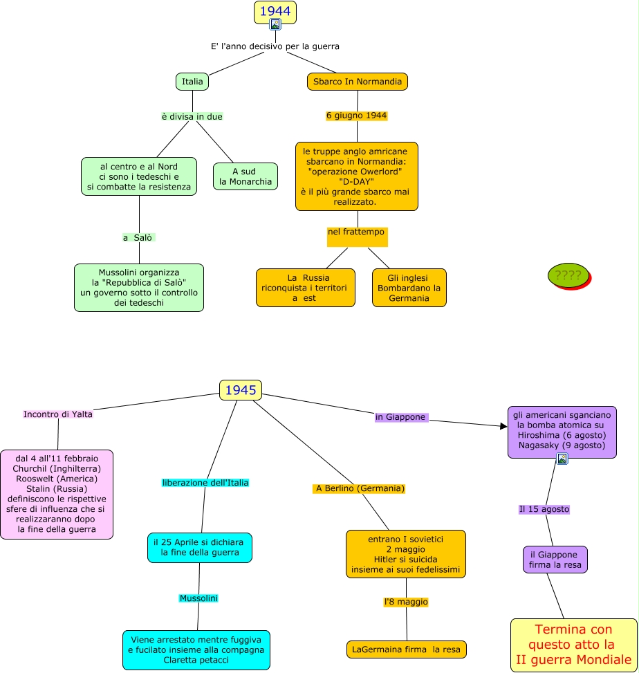 Questa Cmap, creata con IHMC CmapTools, contiene informazioni relative a: Seconda guerramondiale IV parte (s.m), 1944 E' l'anno decisivo per la guerra Sbarco In Normandia, gli americani sganciano la bomba atomica su Hiroshima (6 agosto) Nagasaky (9 agosto) Il 15 agosto il Giappone firma la resa, le truppe anglo amricane sbarcano in Normandia: "operazione Owerlord" "D-DAY" è il più grande sbarco mai realizzato. nel frattempo Gli inglesi Bombardano la Germania, 1944 E' l'anno decisivo per la guerra Italia, il 25 Aprile si dichiara la fine della guerra Mussolini Viene arrestato mentre fuggiva e fucilato insieme alla compagna Claretta petacci, entrano I sovietici 2 maggio Hitler si suicida insieme ai suoi fedelissimi l'8 maggio LaGermaina firma la resa, 1945 A Berlino (Germania) entrano I sovietici 2 maggio Hitler si suicida insieme ai suoi fedelissimi, 1945 Incontro di Yalta dal 4 all'11 febbraio Churchil (Inghilterra) Rooswelt (America) Stalin (Russia) definiscono le rispettive sfere di influenza che si realizzaranno dopo la fine della guerra, Italia è divisa in due A sud la Monarchia, 1945 liberazione dell'Italia il 25 Aprile si dichiara la fine della guerra, le truppe anglo amricane sbarcano in Normandia: "operazione Owerlord" "D-DAY" è il più grande sbarco mai realizzato. nel frattempo La Russia riconquista i territori a est, Italia è divisa in due al centro e al Nord ci sono i tedeschi e si combatte la resistenza, 1945 in Giappone gli americani sganciano la bomba atomica su Hiroshima (6 agosto) Nagasaky (9 agosto), al centro e al Nord ci sono i tedeschi e si combatte la resistenza a Salò Mussolini organizza la "Repubblica di Salò" un governo sotto il controllo dei tedeschi, Sbarco In Normandia 6 giugno 1944 le truppe anglo amricane sbarcano in Normandia: "operazione Owerlord" "D-DAY" è il più grande sbarco mai realizzato., il Giappone firma la resa ???? Termina con questo atto la II guerra Mondiale