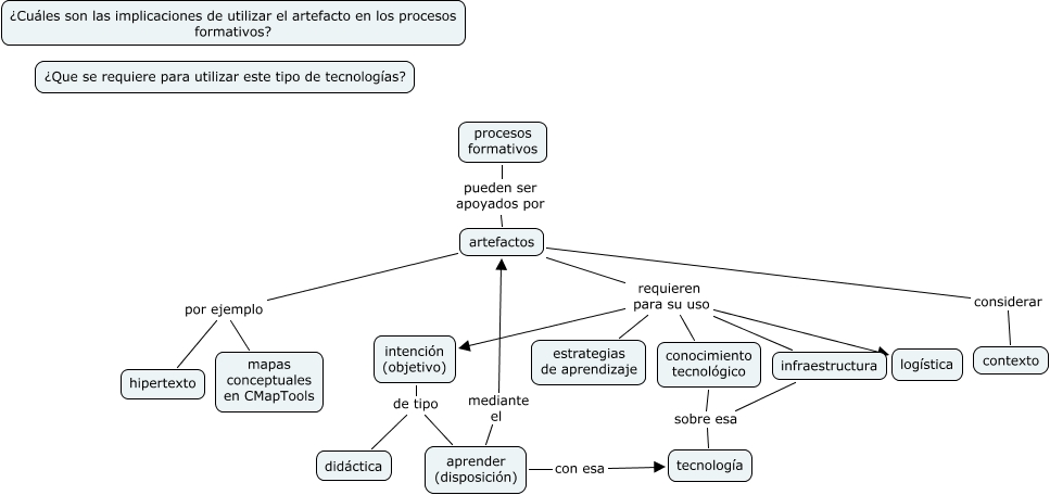 Este Cmap, tiene información relacionada con: Sesión Artefactos 4 marzo Protocolo Gerardo y Lilia, infraestructura sobre esa tecnología, artefactos requieren para su uso intención (objetivo), artefactos por ejemplo mapas conceptuales en CMapTools, intención (objetivo) de tipo aprender (disposición), artefactos requieren para su uso logística, artefactos requieren para su uso estrategias de aprendizaje, artefactos considerar contexto, artefactos por ejemplo hipertexto, aprender (disposición) con esa tecnología, procesos formativos pueden ser apoyados por artefactos, artefactos requieren para su uso conocimiento tecnológico, aprender (disposición) mediante el artefactos, intención (objetivo) de tipo didáctica, artefactos requieren para su uso infraestructura, conocimiento tecnológico sobre esa tecnología