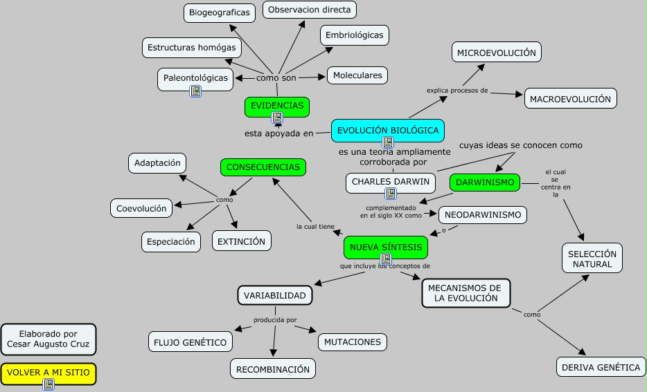 Este Cmap, tiene información relacionada con: Teoría de la Evolución, NUEVA SÍNTESIS la cual tiene CONSECUENCIAS, VARIABILIDAD producida por MUTACIONES, EVOLUCIÓN BIOLÓGICA esta apoyada en EVIDENCIAS, NUEVA SÍNTESIS que incluye los conceptos de VARIABILIDAD, CONSECUENCIAS como Coevolución, EVOLUCIÓN BIOLÓGICA es una teoría ampliamente corroborada por CHARLES DARWIN, VARIABILIDAD producida por FLUJO GENÉTICO, EVIDENCIAS como son Embriológicas, VARIABILIDAD producida por RECOMBINACIÓN, EVIDENCIAS como son Moleculares, CONSECUENCIAS como EXTINCIÓN, DARWINISMO complementado en el siglo XX como NEODARWINISMO, NEODARWINISMO o NUEVA SÍNTESIS, EVIDENCIAS como son Biogeograficas, CHARLES DARWIN cuyas ideas se conocen como DARWINISMO, EVIDENCIAS como son Observacion directa, DARWINISMO el cual se centra en la SELECCIÓN NATURAL, MECANISMOS DE LA EVOLUCIÓN como SELECCIÓN NATURAL, MECANISMOS DE LA EVOLUCIÓN como DERIVA GENÉTICA, CONSECUENCIAS como Adaptación