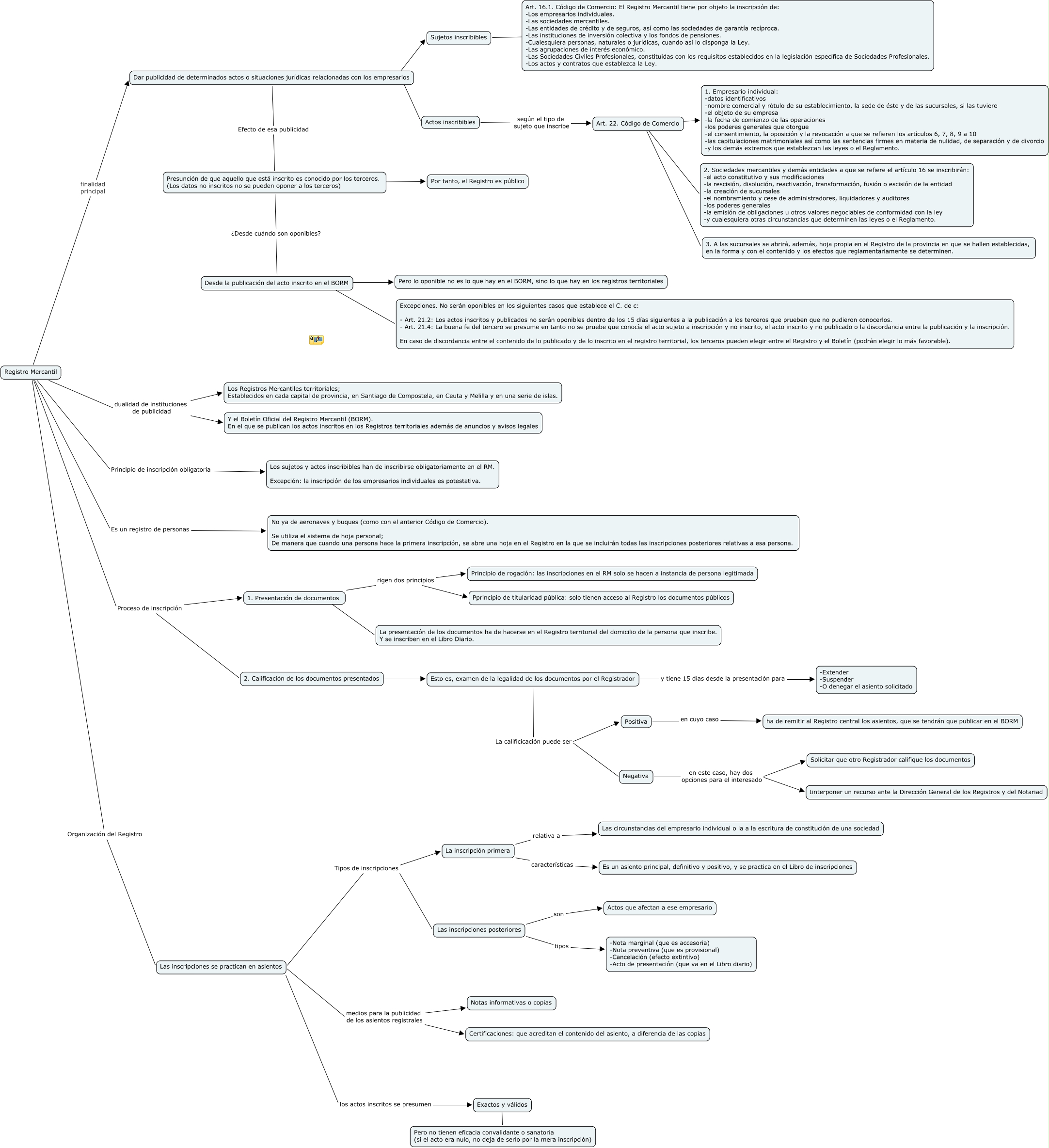 Este Cmap, tiene información relacionada con: Mercantil II - Caso 3, 1. Presentación de documentos rigen dos principios Pprincipio de titularidad pública: solo tienen acceso al Registro los documentos públicos, Presunción de que aquello que está inscrito es conocido por los terceros. (Los datos no inscritos no se pueden oponer a los terceros) ???? Por tanto, el Registro es público, Registro Mercantil finalidad principal Dar publicidad de determinados actos o situaciones jurídicas relacionadas con los empresarios, Actos inscribibles según el tipo de sujeto que inscribe Art. 22. Código de Comercio, Art. 22. Código de Comercio ???? 2. Sociedades mercantiles y demás entidades a que se refiere el artículo 16 se inscribirán: -el acto constitutivo y sus modificaciones -la rescisión, disolución, reactivación, transformación, fusión o escisión de la entidad -la creación de sucursales -el nombramiento y cese de administradores, liquidadores y auditores -los poderes generales -la emisión de obligaciones u otros valores negociables de conformidad con la ley -y cualesquiera otras circunstancias que determinen las leyes o el Reglamento., Art. 22. Código de Comercio ???? 3. A las sucursales se abrirá, además, hoja propia en el Registro de la provincia en que se hallen establecidas, en la forma y con el contenido y los efectos que reglamentariamente se determinen., Registro Mercantil dualidad de instituciones de publicidad Los Registros Mercantiles territoriales; Establecidos en cada capital de provincia, en Santiago de Compostela, en Ceuta y Melilla y en una serie de islas., 1. Presentación de documentos rigen dos principios Principio de rogación: las inscripciones en el RM solo se hacen a instancia de persona legitimada, Las inscripciones se practican en asientos medios para la publicidad de los asientos registrales Certificaciones: que acreditan el contenido del asiento, a diferencia de las copias, Desde la publicación del acto inscrito en el BORM ???? Pero lo oponible no es lo que hay en el BORM, sino lo que hay en los registros territoriales, Negativa en este caso, hay dos opciones para el interesado Solicitar que otro Registrador califique los documentos, Positiva en cuyo caso ha de remitir al Registro central los asientos, que se tendrán que publicar en el BORM, Sujetos inscribibles ???? Art. 16.1. Código de Comercio: El Registro Mercantil tiene por objeto la inscripción de: -Los empresarios individuales. -Las sociedades mercantiles. -Las entidades de crédito y de seguros, así como las sociedades de garantía recíproca. -Las instituciones de inversión colectiva y los fondos de pensiones. -Cualesquiera personas, naturales o jurídicas, cuando así lo disponga la Ley. -Las agrupaciones de interés económico. -Las Sociedades Civiles Profesionales, constituidas con los requisitos establecidos en la legislación específica de Sociedades Profesionales. -Los actos y contratos que establezca la Ley., Las inscripciones se practican en asientos los actos inscritos se presumen Exactos y válidos, Las inscripciones posteriores son Actos que afectan a ese empresario, Las inscripciones se practican en asientos Tipos de inscripciones La inscripción primera, Registro Mercantil Es un registro de personas No ya de aeronaves y buques (como con el anterior Código de Comercio). Se utiliza el sistema de hoja personal; De manera que cuando una persona hace la primera inscripción, se abre una hoja en el Registro en la que se incluirán todas las inscripciones posteriores relativas a esa persona., Art. 22. Código de Comercio ???? 1. Empresario individual: -datos identificativos -nombre comercial y rótulo de su establecimiento, la sede de éste y de las sucursales, si las tuviere -el objeto de su empresa -la fecha de comienzo de las operaciones -los poderes generales que otorgue -el consentimiento, la oposición y la revocación a que se refieren los artículos 6, 7, 8, 9 a 10 -las capitulaciones matrimoniales así como las sentencias firmes en materia de nulidad, de separación y de divorcio -y los demás extremos que establezcan las leyes o el Reglamento., Negativa en este caso, hay dos opciones para el interesado Iinterponer un recurso ante la Dirección General de los Registros y del Notariad, Esto es, examen de la legalidad de los documentos por el Registrador y tiene 15 días desde la presentación para -Extender -Suspender -O denegar el asiento solicitado