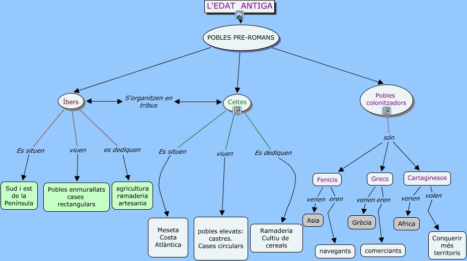 Este Cmap, tiene información relacionada con: Edat antiga 2, Cartaginesos volen Conquerir més territoris, Pobles colonitzadors són Fenicis, Celtes viuen pobles elevats: castres. Cases circulars, Fenicis eren navegants, L'EDAT ANTIGA POBLES PRE-ROMANS, Grecs eren comerciants, Grecs venen Grècia, Fenicis venen Asia, Pobles colonitzadors són Grecs, Íbers es dediquen agricultura ramaderia artesania, POBLES PRE-ROMANS Pobles colonitzadors, Pobles colonitzadors són Cartaginesos, Celtes Es situen Meseta Costa Atlàntica, POBLES PRE-ROMANS Celtes, POBLES PRE-ROMANS Íbers, Celtes Es dediquen Ramaderia Cultiu de cereals, Íbers Es situen Sud i est de la Península, Íbers viuen Pobles enmurallats cases rectangulars, Cartaginesos venen Africa, Íbers S'organitzen en tribus Celtes