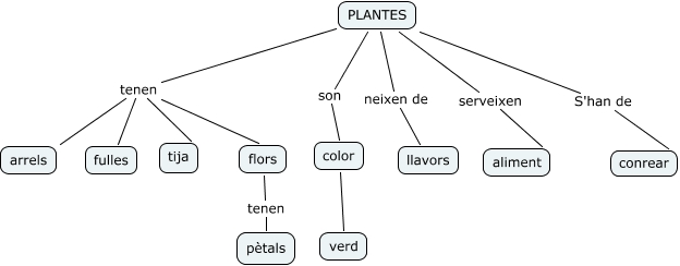 Este Cmap, tiene información relacionada con: Plantes, PLANTES S'han de conrear, PLANTES tenen tija, color verd, PLANTES tenen fulles, PLANTES serveixen aliment, PLANTES son color, flors tenen pètals, PLANTES neixen de llavors, PLANTES tenen flors, PLANTES tenen arrels