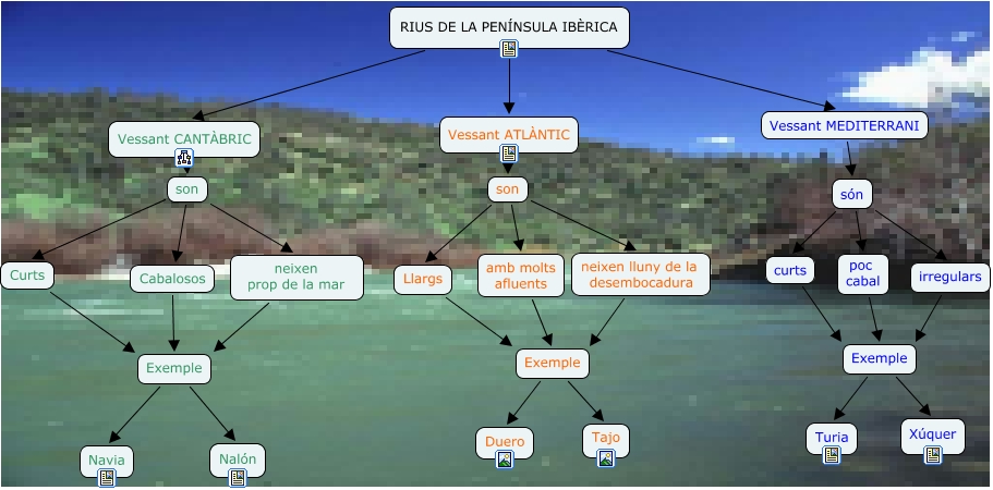 Este Cmap, tiene información relacionada con: PRESENTACIÓ RIUS D'ESPANYA, són irregulars, amb molts afluents Exemple, poc cabal Exemple, Vessant ATLÀNTIC son, RIUS DE LA PENÍNSULA IBÈRICA Vessant ATLÀNTIC, RIUS DE LA PENÍNSULA IBÈRICA Vessant CANTÀBRIC, Vessant CANTÀBRIC son, curts Exemple, Curts Exemple, són poc cabal, Exemple Navia, Llargs Exemple, Cabalosos Exemple, RIUS DE LA PENÍNSULA IBÈRICA Vessant MEDITERRANI, són curts, Exemple Tajo, son Curts, son Cabalosos, irregulars Exemple, son Llargs