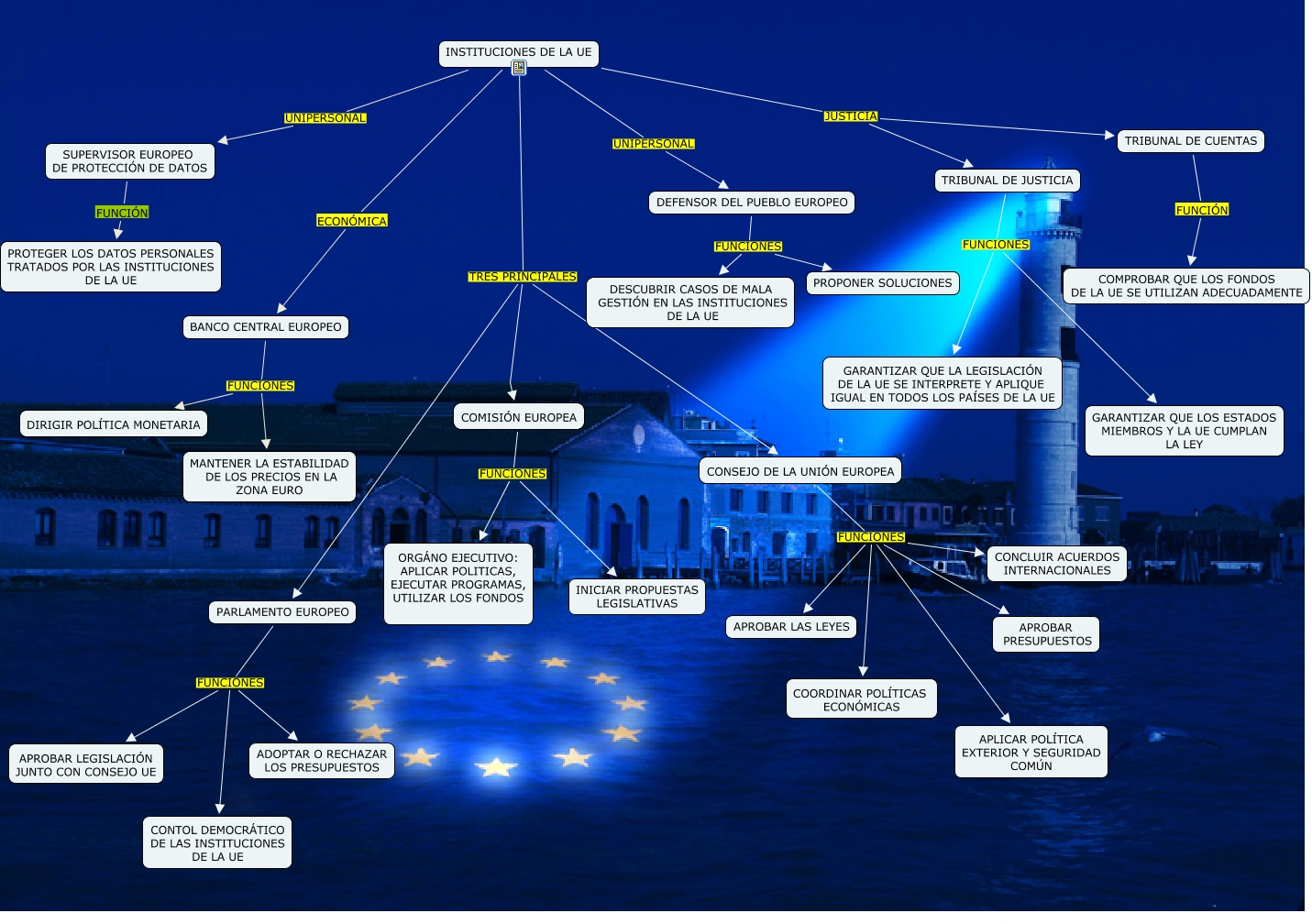 Este Cmap, tiene información relacionada con: INSTITUCIONES UE, INSTITUCIONES DE LA UE TRES PRINCIPALES COMISIÓN EUROPEA, TRIBUNAL DE CUENTAS FUNCIÓN COMPROBAR QUE LOS FONDOS DE LA UE SE UTILIZAN ADECUADAMENTE, COMISIÓN EUROPEA FUNCIONES ORGÁNO EJECUTIVO: APLICAR POLITICAS, EJECUTAR PROGRAMAS, UTILIZAR LOS FONDOS, INSTITUCIONES DE LA UE JUSTICIA TRIBUNAL DE CUENTAS, SUPERVISOR EUROPEO DE PROTECCIÓN DE DATOS FUNCIÓN PROTEGER LOS DATOS PERSONALES TRATADOS POR LAS INSTITUCIONES DE LA UE, CONSEJO DE LA UNIÓN EUROPEA FUNCIONES COORDINAR POLÍTICAS ECONÓMICAS, TRIBUNAL DE JUSTICIA FUNCIONES GARANTIZAR QUE LA LEGISLACIÓN DE LA UE SE INTERPRETE Y APLIQUE IGUAL EN TODOS LOS PAÍSES DE LA UE, INSTITUCIONES DE LA UE TRES PRINCIPALES CONSEJO DE LA UNIÓN EUROPEA, DEFENSOR DEL PUEBLO EUROPEO FUNCIONES PROPONER SOLUCIONES, PARLAMENTO EUROPEO FUNCIONES ADOPTAR O RECHAZAR LOS PRESUPUESTOS, INSTITUCIONES DE LA UE UNIPERSONAL DEFENSOR DEL PUEBLO EUROPEO, BANCO CENTRAL EUROPEO FUNCIONES MANTENER LA ESTABILIDAD DE LOS PRECIOS EN LA ZONA EURO, INSTITUCIONES DE LA UE JUSTICIA TRIBUNAL DE JUSTICIA, CONSEJO DE LA UNIÓN EUROPEA FUNCIONES CONCLUIR ACUERDOS INTERNACIONALES, INSTITUCIONES DE LA UE ECONÓMICA BANCO CENTRAL EUROPEO, TRIBUNAL DE JUSTICIA FUNCIONES GARANTIZAR QUE LOS ESTADOS MIEMBROS Y LA UE CUMPLAN LA LEY, PARLAMENTO EUROPEO FUNCIONES APROBAR LEGISLACIÓN JUNTO CON CONSEJO UE, CONSEJO DE LA UNIÓN EUROPEA FUNCIONES APROBAR PRESUPUESTOS, INSTITUCIONES DE LA UE TRES PRINCIPALES PARLAMENTO EUROPEO, PARLAMENTO EUROPEO FUNCIONES CONTOL DEMOCRÁTICO DE LAS INSTITUCIONES DE LA UE