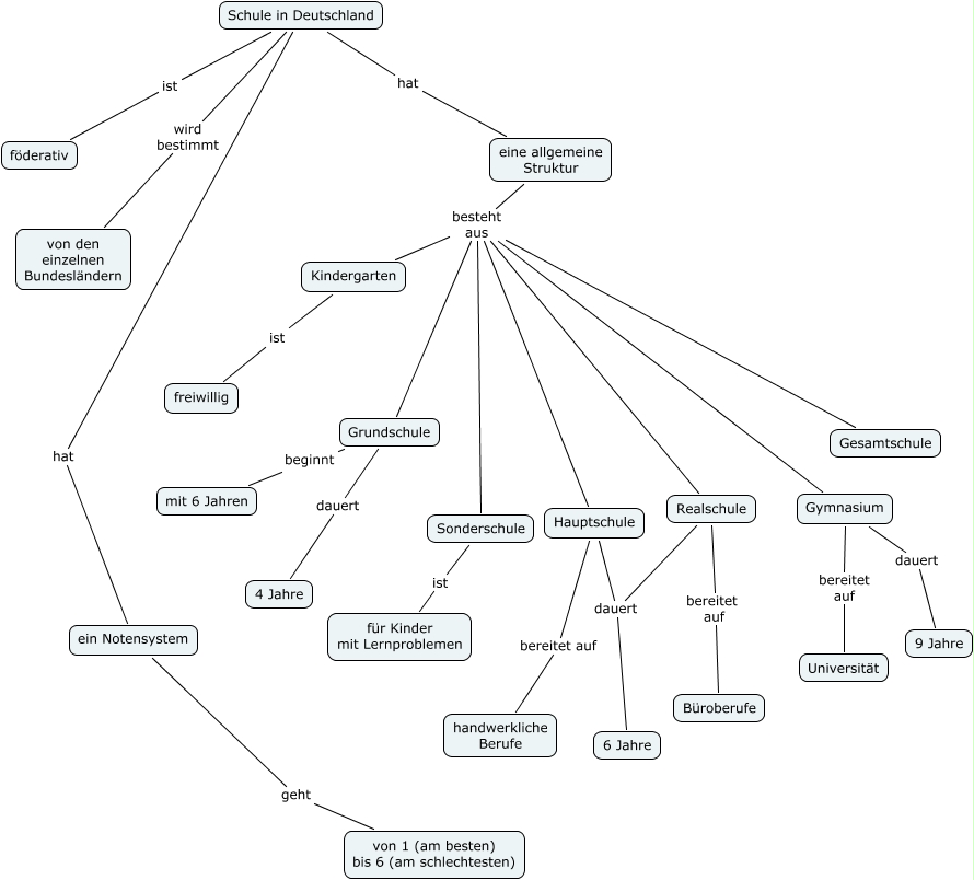 Questa Cmap, creata con IHMC CmapTools, contiene informazioni relative a: Schulsystem, Kindergarten ist freiwillig, Schule in Deutschland ist föderativ, Grundschule beginnt mit 6 Jahren, eine allgemeine Struktur besteht aus Hauptschule, eine allgemeine Struktur besteht aus Realschule, Gymnasium dauert 9 Jahre, Gymnasium bereitet auf Universität, Hauptschule bereitet auf handwerkliche Berufe, Schule in Deutschland hat eine allgemeine Struktur, Realschule dauert 6 Jahre, eine allgemeine Struktur besteht aus Gesamtschule, eine allgemeine Struktur besteht aus Kindergarten, Hauptschule dauert 6 Jahre, Schule in Deutschland hat ein Notensystem, Schule in Deutschland wird bestimmt von den einzelnen Bundesländern, Realschule bereitet auf Büroberufe, eine allgemeine Struktur besteht aus Gymnasium, ein Notensystem geht von 1 (am besten) bis 6 (am schlechtesten), Sonderschule ist für Kinder mit Lernproblemen, eine allgemeine Struktur besteht aus Grundschule