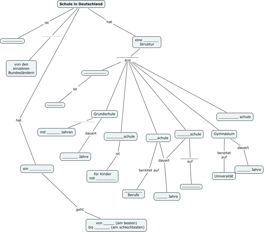 Questa Cmap, creata con IHMC CmapTools, contiene informazioni relative a: Schulsystem_leer, __________ ist _______, Schule in Deutschland ist _________, Grundschule __________ mit ______ Jahren, eine _______ Struktur __________ aus ____schule, eine _______ Struktur __________ aus ______schule, Gymnasium dauert ______ Jahre, Gymnasium bereitet auf Universität, ____schule bereitet auf ________ Berufe, Schule in Deutschland hat eine _______ Struktur, ______schule dauert _____ Jahre, eine _______ Struktur __________ aus _________ schule, eine _______ Struktur __________ aus __________, ____schule dauert _____ Jahre, Schule in Deutschland hat ein __________, Schule in Deutschland ________ von den einzelnen Bundesländern, ______schule ________ auf ________, eine _______ Struktur __________ aus Gymnasium, ein __________ geht von _____ (am besten) bis _______ (am schlechtesten), ________schule ist für Kinder mit _________, eine _______ Struktur __________ aus Grundschule