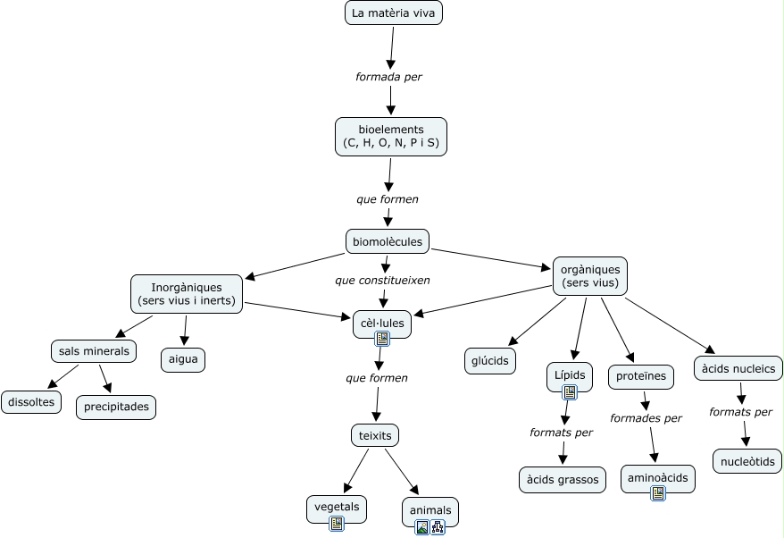 Este Cmap, tiene información relacionada con: Composició de la matèria viva, Inorgàniques (sers vius i inerts) sals minerals, orgàniques (sers vius) glúcids, orgàniques (sers vius) proteïnes, cèl·lules que formen teixits, orgàniques (sers vius) Lípids, sals minerals precipitades, La matèria viva formada per bioelements (C, H, O, N, P i S), bioelements (C, H, O, N, P i S) que formen biomolècules, sals minerals dissoltes, orgàniques (sers vius) àcids nucleics, proteïnes formades per aminoàcids, teixits animals, Inorgàniques (sers vius i inerts) cèl·lules, àcids nucleics formats per nucleòtids, orgàniques (sers vius) cèl·lules, Lípids formats per àcids grassos, biomolècules que constitueixen cèl·lules, biomolècules Inorgàniques (sers vius i inerts), Inorgàniques (sers vius i inerts) aigua, teixits vegetals