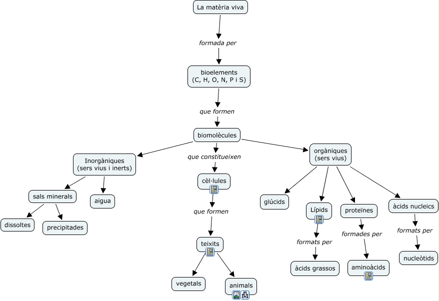 Aquest mapa conceptual conté informació relacionada amb: Presentació composició de la matèria viva, Inorgàniques (sers vius i inerts) sals minerals, orgàniques (sers vius) proteïnes, orgàniques (sers vius) glúcids, sals minerals precipitades, orgàniques (sers vius) Lípids, cèl·lules que formen teixits, La matèria viva formada per bioelements (C, H, O, N, P i S), sals minerals dissoltes, bioelements (C, H, O, N, P i S) que formen biomolècules, orgàniques (sers vius) àcids nucleics, proteïnes formades per aminoàcids, Inorgàniques (sers vius i inerts) cèl·lules, teixits animals, àcids nucleics formats per nucleòtids, orgàniques (sers vius) cèl·lules, biomolècules que constitueixen cèl·lules, Lípids formats per àcids grassos, biomolècules Inorgàniques (sers vius i inerts), Inorgàniques (sers vius i inerts) aigua, teixits vegetals