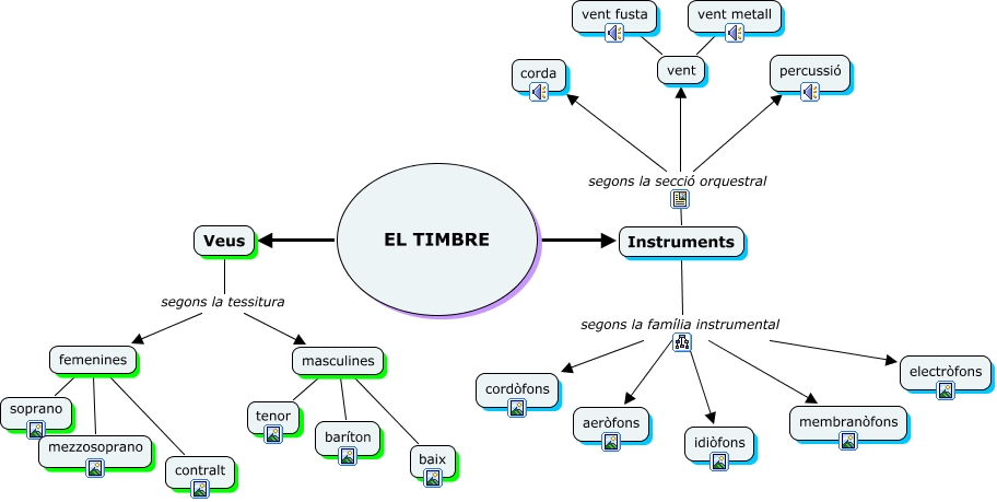 Aquest mapa conceptual conté informació relacionada amb: Timbre, masculines baríton, Instruments segons la família instrumental cordòfons, masculines baix, Instruments segons la secció orquestral vent, masculines tenor, Veus segons la tessitura femenines, Instruments segons la família instrumental idiòfons, Instruments segons la família instrumental membranòfons, Instruments segons la secció orquestral corda, vent vent metall, femenines mezzosoprano, Instruments segons la secció orquestral percussió, Instruments segons la família instrumental electròfons, Instruments segons la família instrumental aeròfons, femenines soprano, Veus segons la tessitura masculines, vent vent fusta, EL TIMBRE Instruments, femenines contralt, EL TIMBRE Veus