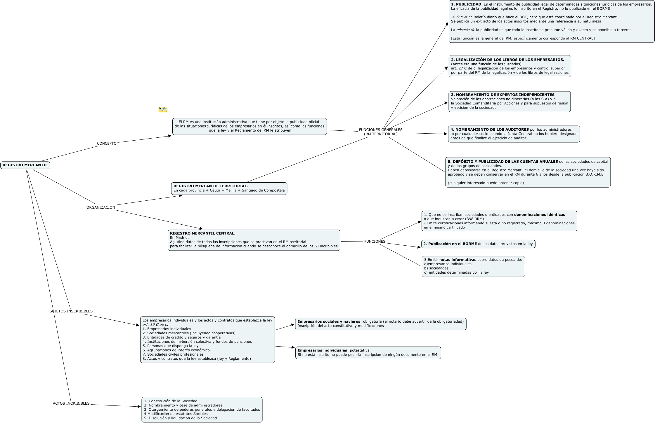 Este Cmap, tiene información relacionada con: MII - ESCENARI 3 - Registro Mercantil, REGISTRO MERCANTIL ORGANIZACIÓN REGISTRO MERCANTIL TERRITORIAL. En cada provincia + Ceuta + Melilla + Santiago de Compostela, REGISTRO MERCANTIL TERRITORIAL. En cada provincia + Ceuta + Melilla + Santiago de Compostela FUNCIONES GENERALES (RM TERRITORIAL) 5. DEPÓSITO Y PUBLICIDAD DE LAS CUENTAS ANUALES de las sociedades de capital y de los grupos de sociedades. Deben depositarse en el Registro Mercantil el domicilio de la sociedad una vez haya sido aprobado y se deben conservar en el RM durante 6 años desde la publicación B.O.R.M.E (cualquier interesado puede obtener copia), REGISTRO MERCANTIL CENTRAL. En Madrid. Aglutina datos de todas las inscripciones que se practivan en el RM territorial para facilitar la búsqueda de información cuando se desconoce el domicilio de los SJ incribibles FUNCIONES 2. Publicación en el BORME de los datos previstos en la ley, REGISTRO MERCANTIL SUJETOS INSCRIBIBLES Los empresarios individuales y los actos y contratos que establezca la ley art. 16 C de c: 1. Empresarios individuales 2. Sociedades mercantiles (incluyendo cooperativas) 3. Entidades de crédito y seguros y garantía 4. Instituciones de invbersión colectiva y fondos de pensiones 5. Personas que disponga la ley 6. Agrupaciones de interés económico 7. Sociedades civiles profesionales 8. Actos y contratos que la ley establezca (ley y Reglamento), REGISTRO MERCANTIL ACTOS INCRIBIBLES 1. Constitución de la Sociedad 2. Nombramiento y cese de administradores 3. Otorgamiento de poderes generales y delegación de facultades 4.Modificación de estatutos Sociales 5. Disolución y liquidación de la Sociedad, El RM es una institución administrativa que tiene por objeto la publicidad oficial de las situaciones jurídicas de los empresarios en él inscritos, así como las funciones que la ley y el Reglamento del RM le atribuyen FUNCIONES GENERALES (RM TERRITORIAL) 5. DEPÓSITO Y PUBLICIDAD DE LAS CUENTAS ANUALES de las sociedades de capital y de los grupos de sociedades. Deben depositarse en el Registro Mercantil el domicilio de la sociedad una vez haya sido aprobado y se deben conservar en el RM durante 6 años desde la publicación B.O.R.M.E (cualquier interesado puede obtener copia), REGISTRO MERCANTIL TERRITORIAL. En cada provincia + Ceuta + Melilla + Santiago de Compostela FUNCIONES GENERALES (RM TERRITORIAL) 2. LEGALIZACIÓN DE LOS LIBROS DE LOS EMPRESARIOS. (Antes era una función de los juzgados) art. 27 C de c. legalización de los empresarios y control superior por parte del RM de la legalización y de los libros de legalizaciones, REGISTRO MERCANTIL CONCEPTO El RM es una institución administrativa que tiene por objeto la publicidad oficial de las situaciones jurídicas de los empresarios en él inscritos, así como las funciones que la ley y el Reglamento del RM le atribuyen, Los empresarios individuales y los actos y contratos que establezca la ley art. 16 C de c: 1. Empresarios individuales 2. Sociedades mercantiles (incluyendo cooperativas) 3. Entidades de crédito y seguros y garantía 4. Instituciones de invbersión colectiva y fondos de pensiones 5. Personas que disponga la ley 6. Agrupaciones de interés económico 7. Sociedades civiles profesionales 8. Actos y contratos que la ley establezca (ley y Reglamento) ???? Empresarios individuales: potestativa Si no está inscrito no puede pedir la inscripción de ningún documento en el RM., El RM es una institución administrativa que tiene por objeto la publicidad oficial de las situaciones jurídicas de los empresarios en él inscritos, así como las funciones que la ley y el Reglamento del RM le atribuyen FUNCIONES GENERALES (RM TERRITORIAL) 3. NOMBRAMIENTO DE EXPERTOS INDEPENDIENTES Valoración de las aportaciones no dinerarias (a las S.A) y a la Sociedad Comanditaria por Acciones y para supuestos de fusión y escisión de la sociedad., REGISTRO MERCANTIL CENTRAL. En Madrid. Aglutina datos de todas las inscripciones que se practivan en el RM territorial para facilitar la búsqueda de información cuando se desconoce el domicilio de los SJ incribibles FUNCIONES 1. Que no se inscriban sociedades o entidades con denominaciones idénticas o que induzcan a error (398 RRM) - Emite certificaciones informando si está o no registrado, máximo 3 denominaciones en el mismo certificado, REGISTRO MERCANTIL TERRITORIAL. En cada provincia + Ceuta + Melilla + Santiago de Compostela FUNCIONES GENERALES (RM TERRITORIAL) 4. NOMBRAMIENTO DE LOS AUDITORES por los administradores o por cualquier socio cuando la Junta General no los hubiere designado antes de que finalice el ejercicio de auditar., REGISTRO MERCANTIL CENTRAL. En Madrid. Aglutina datos de todas las inscripciones que se practivan en el RM territorial para facilitar la búsqueda de información cuando se desconoce el domicilio de los SJ incribibles FUNCIONES 3.Emitir notas informativas sobre datos qu posea de: a)empresarios individuales b) sociedades c) entidades determinadas por la ley, REGISTRO MERCANTIL TERRITORIAL. En cada provincia + Ceuta + Melilla + Santiago de Compostela FUNCIONES GENERALES (RM TERRITORIAL) 3. NOMBRAMIENTO DE EXPERTOS INDEPENDIENTES Valoración de las aportaciones no dinerarias (a las S.A) y a la Sociedad Comanditaria por Acciones y para supuestos de fusión y escisión de la sociedad., REGISTRO MERCANTIL ORGANIZACIÓN REGISTRO MERCANTIL CENTRAL. En Madrid. Aglutina datos de todas las inscripciones que se practivan en el RM territorial para facilitar la búsqueda de información cuando se desconoce el domicilio de los SJ incribibles, El RM es una institución administrativa que tiene por objeto la publicidad oficial de las situaciones jurídicas de los empresarios en él inscritos, así como las funciones que la ley y el Reglamento del RM le atribuyen FUNCIONES GENERALES (RM TERRITORIAL) 4. NOMBRAMIENTO DE LOS AUDITORES por los administradores o por cualquier socio cuando la Junt