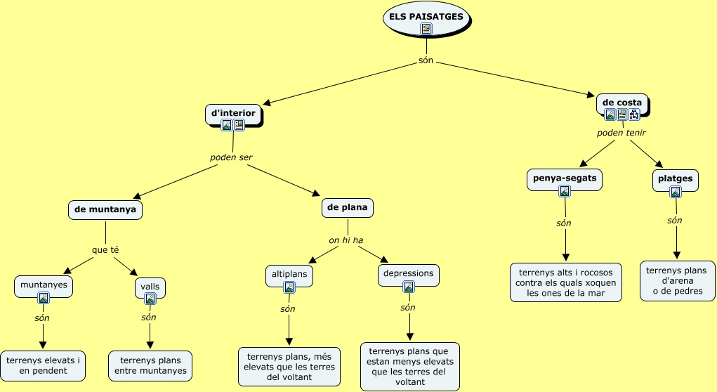 Este Cmap, tiene información relacionada con: Els paisatges, ELS PAISATGES són de costa, d'interior poden ser de plana, altiplans són terrenys plans, més elevats que les terres del voltant, valls són terrenys plans entre muntanyes, d'interior poden ser de muntanya, ELS PAISATGES són d'interior, platges són terrenys plans d'arena o de pedres, de plana on hi ha depressions, penya-segats són terrenys alts i rocosos contra els quals xoquen les ones de la mar, de costa poden tenir platges, de plana on hi ha altiplans, muntanyes són terrenys elevats i en pendent, de costa poden tenir penya-segats, depressions són terrenys plans que estan menys elevats que les terres del voltant, de muntanya que té muntanyes, de muntanya que té valls