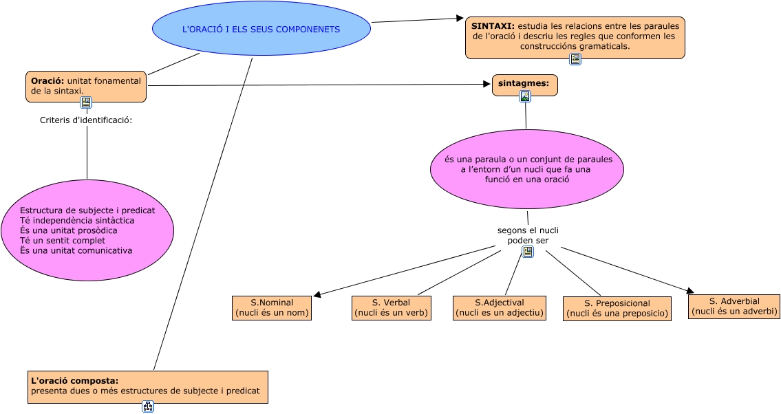 Aquest mapa conceptual conté informació relacionada amb: presentació sintaxi, L'ORACIÓ I ELS SEUS COMPONENETS SINTAXI: estudia les relacions entre les paraules de l'oració i descriu les regles que conformen les construccións gramaticals., L'ORACIÓ I ELS SEUS COMPONENETS Oració: unitat fonamental de la sintaxi., és una paraula o un conjunt de paraules a l’entorn d’un nucli que fa una funció en una oració segons el nucli poden ser S.Adjectival (nucli es un adjectiu), sintagmes: és una paraula o un conjunt de paraules a l’entorn d’un nucli que fa una funció en una oració, L'ORACIÓ I ELS SEUS COMPONENETS L'oració composta: presenta dues o més estructures de subjecte i predicat, és una paraula o un conjunt de paraules a l’entorn d’un nucli que fa una funció en una oració segons el nucli poden ser S. Preposicional (nucli és una preposicio), Oració: unitat fonamental de la sintaxi. Criteris d'identificació: Estructura de subjecte i predicat Té independència sintàctica És una unitat prosòdica Té un sentit complet Ës una unitat comunicativa, Oració: unitat fonamental de la sintaxi. sintagmes:, és una paraula o un conjunt de paraules a l’entorn d’un nucli que fa una funció en una oració segons el nucli poden ser S. Adverbial (nucli és un adverbi), és una paraula o un conjunt de paraules a l’entorn d’un nucli que fa una funció en una oració segons el nucli poden ser S. Verbal (nucli és un verb), és una paraula o un conjunt de paraules a l’entorn d’un nucli que fa una funció en una oració segons el nucli poden ser S.Nominal (nucli és un nom)