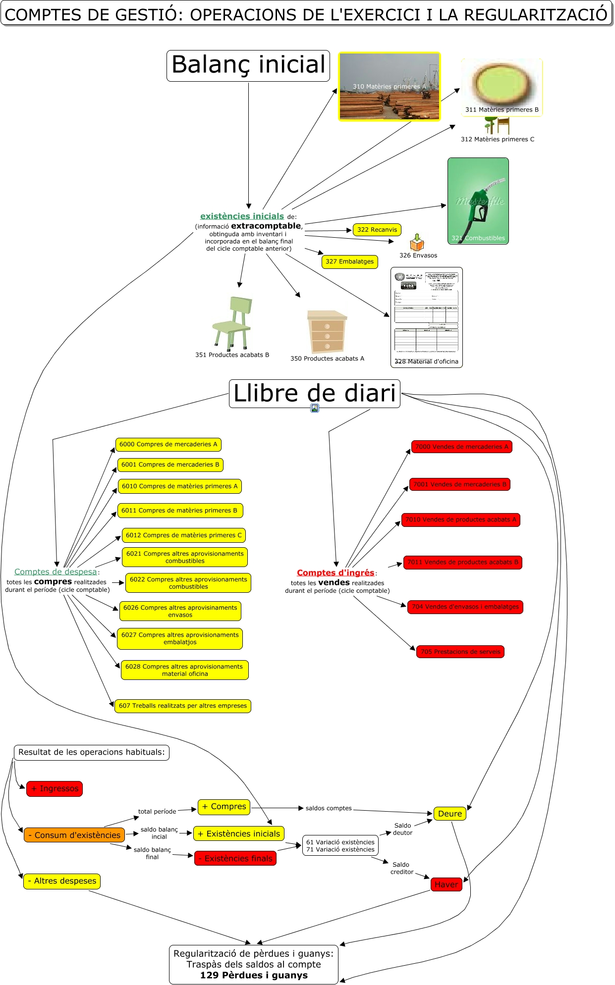 Aquest mapa conceptual conté informació relacionada amb: Regularització d'existències amb dibuixos, Llibre de diari Comptes de despesa: totes les compres realitzades durant el període (cicle comptable) 6012 Compres de matèries primeres C, Deure Regularització de pèrdues i guanys: Traspàs dels saldos al compte 129 Pèrdues i guanys, Llibre de diari Comptes de despesa: totes les compres realitzades durant el període (cicle comptable) 6010 Compres de matèries primeres A, - Consum d'existències saldo balanç final - Existències finals, Balanç inicial existències inicials de: (informació extracomptable, obtinguda amb inventari i incorporada en el balanç final del cicle comptable anterior) + Existències inicials, Balanç inicial existències inicials de: (informació extracomptable, obtinguda amb inventari i incorporada en el balanç final del cicle comptable anterior) 312 Matèries primeres C, Llibre de diari Comptes de despesa: totes les compres realitzades durant el període (cicle comptable) 6027 Compres altres aprovisionaments embalatjos, Llibre de diari Comptes de despesa: totes les compres realitzades durant el període (cicle comptable) 6021 Compres altres aprovisionaments combustibles, Balanç inicial existències inicials de: (informació extracomptable, obtinguda amb inventari i incorporada en el balanç final del cicle comptable anterior) 351 Productes acabats B, 61 Variació existències 71 Variació existències Saldo deutor Deure, Balanç inicial existències inicials de: (informació extracomptable, obtinguda amb inventari i incorporada en el balanç final del cicle comptable anterior) 321 Combustibles, - Consum d'existències total període + Compres, Balanç inicial existències inicials de: (informació extracomptable, obtinguda amb inventari i incorporada en el balanç final del cicle comptable anterior) 350 Productes acabats A, Llibre de diari Comptes de despesa: totes les compres realitzades durant el període (cicle comptable) 6022 Compres altres aprovisionaments combustibles, - Existències finals 61 Variació existències 71 Variació existències, Llibre de diari Regularització de pèrdues i guanys: Traspàs dels saldos al compte 129 Pèrdues i guanys, Resultat de les operacions habituals: - Altres despeses, Llibre de diari Comptes de despesa: totes les compres realitzades durant el període (cicle comptable) 6001 Compres de mercaderies B, Llibre de diari Comptes d'ingrés: totes les vendes realitzades durant el període (cicle comptable) 704 Vendes d'envasos i embalatges, Llibre de diari Comptes d'ingrés: totes les vendes realitzades durant el període (cicle comptable) 705 Prestacions de serveis