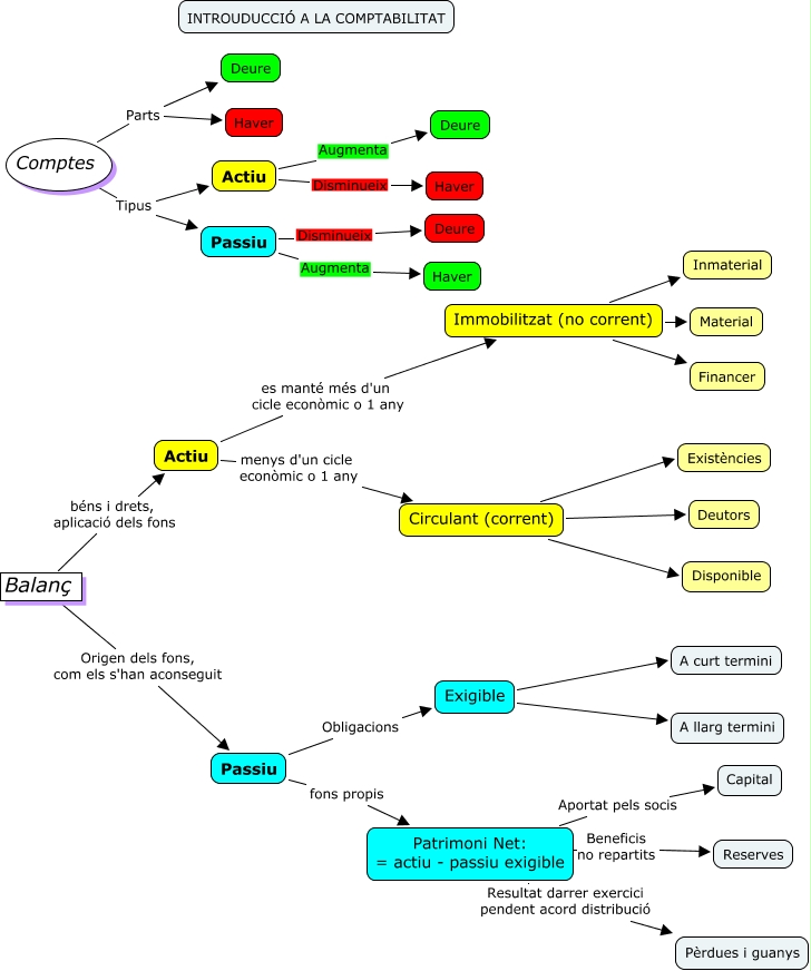 Aquest mapa conceptual conté informació relacionada amb: Introducció a la comptabilitat, Patrimoni Net: = actiu - passiu exigible Aportat pels socis Capital, Actiu Augmenta Deure, Exigible A llarg termini, Exigible A curt termini, Passiu Augmenta Haver, Balanç Origen dels fons, com els s'han aconseguit Passiu, Immobilitzat (no corrent) Material, Circulant (corrent) Disponible, Comptes Parts Haver, Actiu menys d'un cicle econòmic o 1 any Circulant (corrent), Circulant (corrent) Existències, Circulant (corrent) Deutors, Immobilitzat (no corrent) Financer, Immobilitzat (no corrent) Inmaterial, Actiu es manté més d'un cicle econòmic o 1 any Immobilitzat (no corrent), Balanç béns i drets, aplicació dels fons Actiu, Passiu Obligacions Exigible, Comptes Tipus Passiu, Passiu Disminueix Deure, Comptes Parts Deure