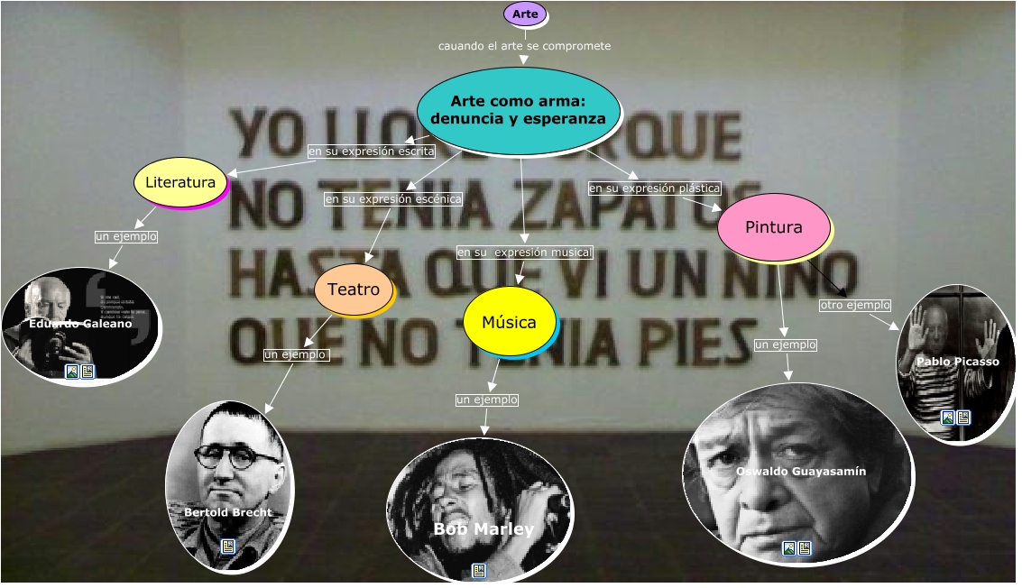 Este Cmap, tiene información relacionada con: Arte como arma_ denuncia y esperanza, Literatura un ejemplo Eduardo Galeano, Arte como arma: denuncia y esperanza en su expresión plástica Pintura, Pintura otro ejemplo Pablo Picasso, Música un ejemplo Bob Marley, Teatro un ejemplo Bertold Brecht, Arte como arma: denuncia y esperanza en su expresión escrita Literatura, Arte como arma: denuncia y esperanza en su expresión musical Música, Arte como arma: denuncia y esperanza en su expresión escénica Teatro, Arte cauando el arte se compromete Arte como arma: denuncia y esperanza, Pintura un ejemplo Oswaldo Guayasamín