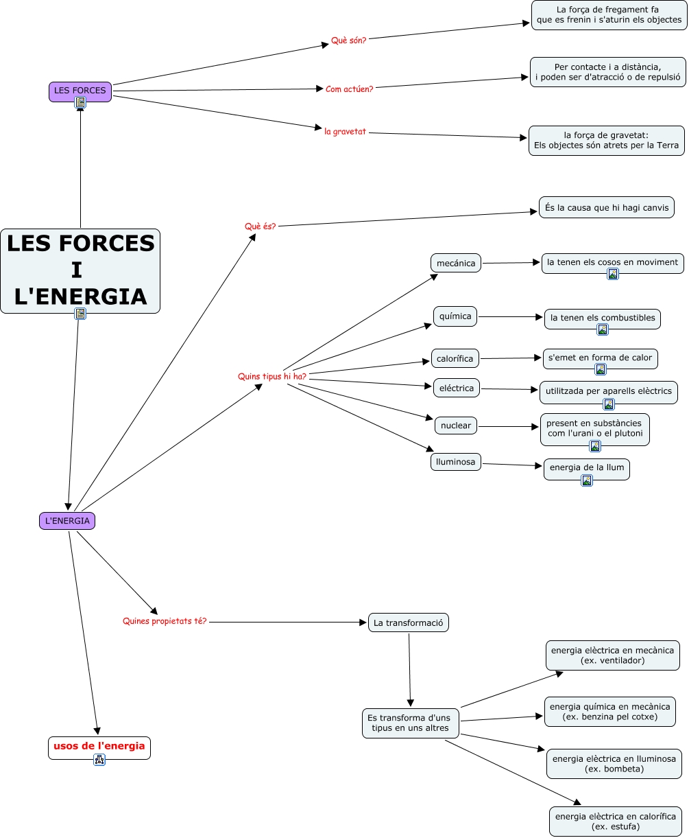 Aquest mapa conceptual conté informació relacionada amb: Les forces i l'energia, L'ENERGIA Quines propietats té? La transformació, L'ENERGIA Què és? És la causa que hi hagi canvis, LES FORCES Com actúen? Per contacte i a distància, i poden ser d'atracció o de repulsió, L'ENERGIA Quins tipus hi ha? mecánica, L'ENERGIA Quins tipus hi ha? nuclear, química la tenen els combustibles, lluminosa energia de la llum, Es transforma d'uns tipus en uns altres energia elèctrica en mecànica (ex. ventilador), L'ENERGIA Quins tipus hi ha? eléctrica, LES FORCES I L'ENERGIA LES FORCES, L'ENERGIA Quins tipus hi ha? calorífica, calorífica s'emet en forma de calor, LES FORCES I L'ENERGIA L'ENERGIA, L'ENERGIA Quins tipus hi ha? química, La transformació Es transforma d'uns tipus en uns altres, LES FORCES la gravetat la força de gravetat: Els objectes són atrets per la Terra, L'ENERGIA Quins tipus hi ha? lluminosa, L'ENERGIA usos de l'energia, nuclear present en substàncies com l'urani o el plutoni, LES FORCES Què són? La força de fregament fa que es frenin i s'aturin els objectes