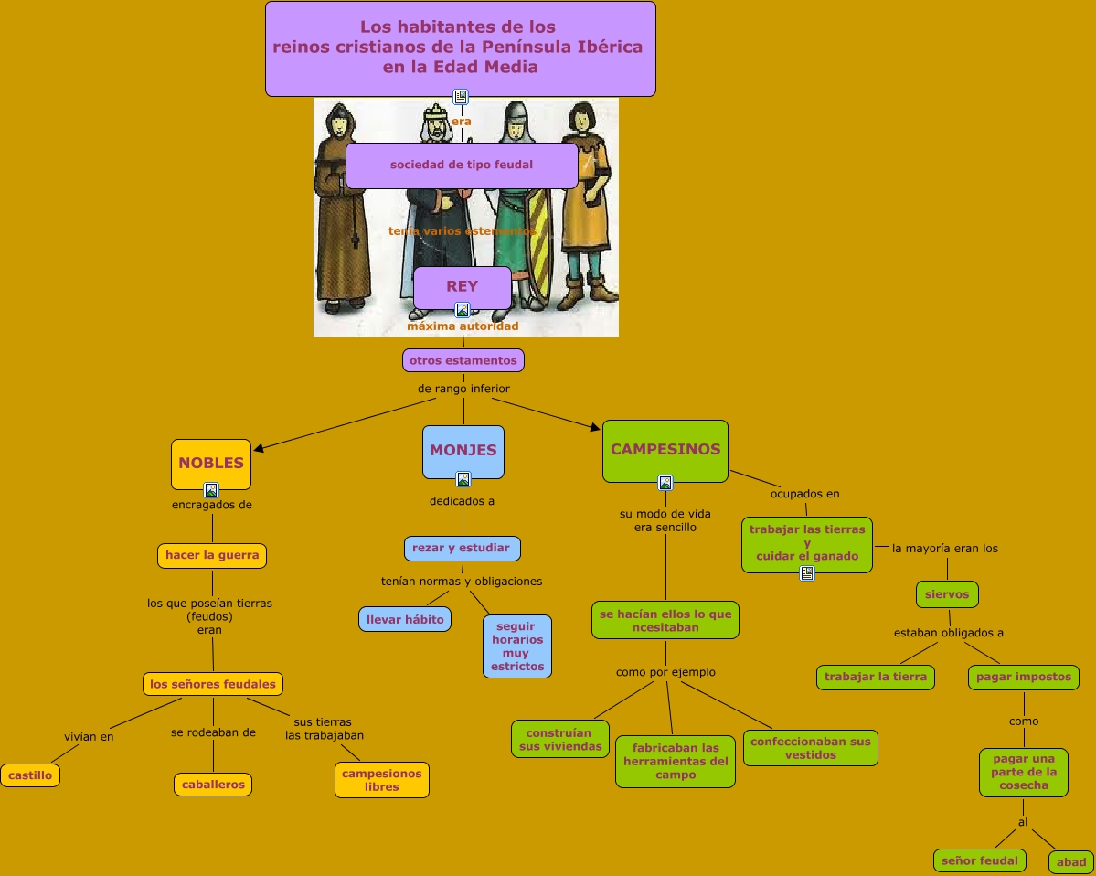 Este Cmap, tiene información relacionada con: Edad Media, pagar una parte de la cosecha al abad, MONJES dedicados a rezar y estudiar, los señores feudales sus tierras las trabajaban campesionos libres, se hacían ellos lo que ncesitaban como por ejemplo construían sus viviendas, NOBLES encragados de hacer la guerra, siervos estaban obligados a trabajar la tierra, se hacían ellos lo que ncesitaban como por ejemplo fabricaban las herramientas del campo, pagar impostos como pagar una parte de la cosecha, los señores feudales se rodeaban de caballeros, otros estamentos de rango inferior CAMPESINOS, los señores feudales vivían en castillo, CAMPESINOS ocupados en trabajar las tierras y cuidar el ganado, REY máxima autoridad otros estamentos, rezar y estudiar tenían normas y obligaciones llevar hábito, CAMPESINOS su modo de vida era sencillo se hacían ellos lo que ncesitaban, otros estamentos de rango inferior NOBLES, rezar y estudiar tenían normas y obligaciones seguir horarios muy estrictos, sociedad de tipo feudal tenía varios estementos REY, se hacían ellos lo que ncesitaban como por ejemplo confeccionaban sus vestidos, hacer la guerra los que poseían tierras (feudos) eran los señores feudales