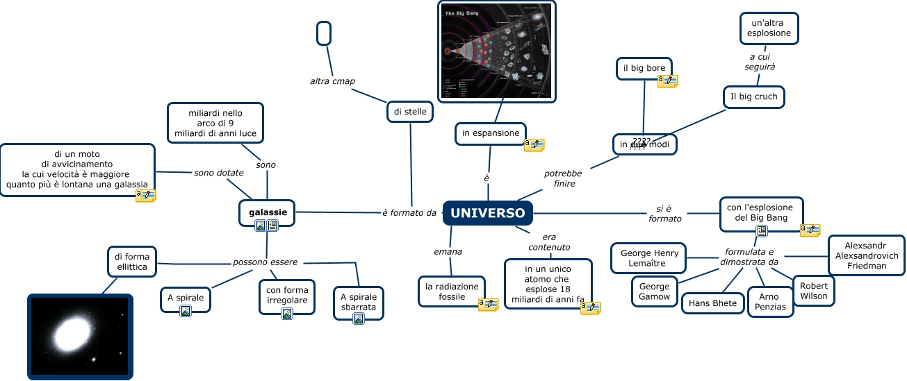 Questa Cmap, creata con IHMC CmapTools, contiene informazioni relative a: l'universo perna, con l'esplosione del Big Bang formulata e dimostrata da George Gamow, UNIVERSO è in espansione, Il big cruch a cui seguirà un'altra esplosione, galassie sono miliardi nello arco di 9 miliardi di anni luce, UNIVERSO era contenuto in un unico atomo che esplose 18 miliardi di anni fa, di stelle altra cmap, UNIVERSO emana la radiazione fossile, in espansione, galassie possono essere di forma ellittica, UNIVERSO si è formato con l'esplosione del Big Bang, con l'esplosione del Big Bang formulata e dimostrata da Alexsandr Alexsandrovich Friedman, UNIVERSO potrebbe finire in due modi, galassie possono essere A spirale, UNIVERSO è formato da galassie, galassie possono essere con forma irregolare, galassie possono essere A spirale sbarrata, galassie sono dotate di un moto di avvicinamento la cui velocità è maggiore quanto più è lontana una galassia, con l'esplosione del Big Bang formulata e dimostrata da Hans Bhete, di forma ellittica ????, in due modi ???? il big bore
