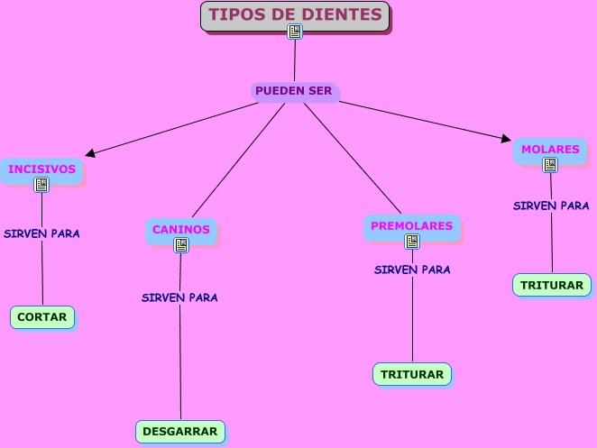Este Cmap, tiene información relacionada con: tipos de dientes, MOLARES SIRVEN PARA TRITURAR, INCISIVOS SIRVEN PARA CORTAR, TIPOS DE DIENTES PUEDEN SER CANINOS, PREMOLARES SIRVEN PARA TRITURAR, TIPOS DE DIENTES PUEDEN SER INCISIVOS, TIPOS DE DIENTES PUEDEN SER PREMOLARES, CANINOS SIRVEN PARA DESGARRAR, TIPOS DE DIENTES PUEDEN SER MOLARES
