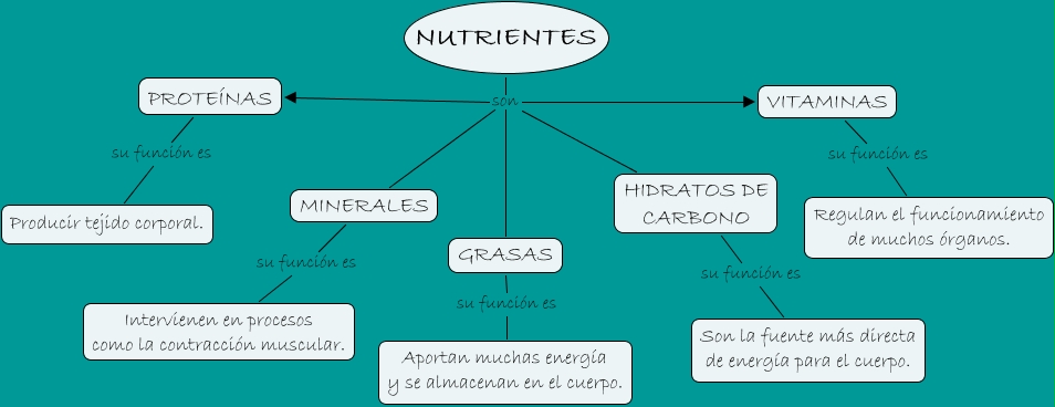 Este Cmap, tiene información relacionada con: nutrientespaula, NUTRIENTES son VITAMINAS, PROTEÍNAS su función es Producir tejido corporal., NUTRIENTES son HIDRATOS DE CARBONO, NUTRIENTES son PROTEÍNAS, MINERALES su función es Intervienen en procesos como la contracción muscular., GRASAS su función es Aportan muchas energía y se almacenan en el cuerpo., HIDRATOS DE CARBONO su función es Son la fuente más directa de energía para el cuerpo., NUTRIENTES son GRASAS, VITAMINAS su función es Regulan el funcionamiento de muchos órganos., NUTRIENTES son MINERALES