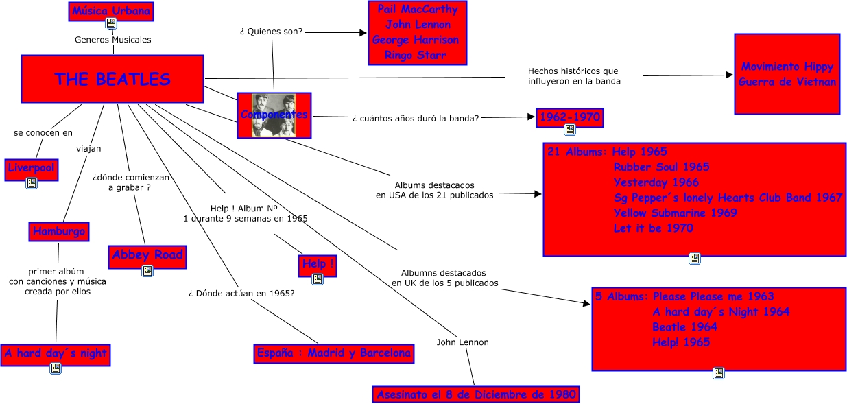 Este Cmap, tiene información relacionada con: The Beatles, THE BEATLES Albumns destacados en UK de los 5 publicados 5 Albums: Please Please me 1963 A hard day´s Night 1964 Beatle 1964 Help! 1965, Componentes ¿ cuántos años duró la banda? 1962-1970, Hamburgo primer albúm con canciones y música creada por ellos A hard day´s night, THE BEATLES ???? Componentes, THE BEATLES Albums destacados en USA de los 21 publicados 21 Albums: Help 1965 Rubber Soul 1965 Yesterday 1966 Sg Pepper´s lonely Hearts Club Band 1967 Yellow Submarine 1969 Let it be 1970, THE BEATLES John Lennon Asesinato el 8 de Diciembre de 1980, THE BEATLES Help ! Album Nº 1 durante 9 semanas en 1965 Help !, THE BEATLES viajan Hamburgo, THE BEATLES ¿dónde comienzan a grabar ? Abbey Road, THE BEATLES ¿ Dónde actúan en 1965? España : Madrid y Barcelona, THE BEATLES se conocen en Liverpool, Componentes ¿ Quienes son? Pail MacCarthy John Lennon George Harrison Ringo Starr, THE BEATLES Hechos históricos que influyeron en la banda Movimiento Hippy Guerra de Vietnan, THE BEATLES Generos Musicales Música Urbana