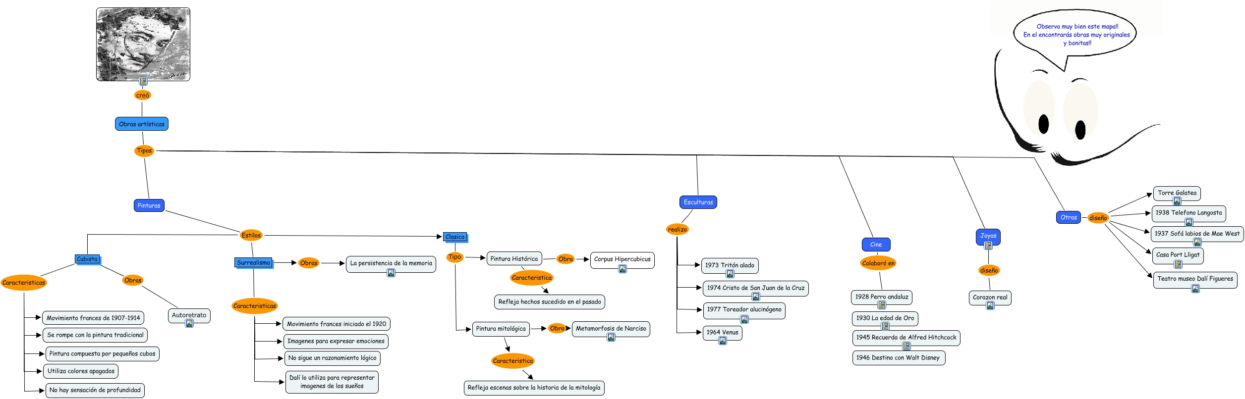 Este Cmap, tiene información relacionada con: Salvador Dalí, Joyas diseño Corazon real, Obras artísticas Tipos Pinturas, Pintura mitológica Caracteristica Refleja escenas sobre la historia de la mitología, Clasico Tipo Pintura Histórica, Surrealismo Caracteristicas No sigue un razonamiento lógico, Pinturas Estilos Clasico, Obras artísticas Tipos Esculturas, Esculturas realizo 1974 Cristo de San Juan de la Cruz, Obras artísticas Tipos Otras, Pintura mitológica Obra Metamorfosis de Narciso, Pintura Histórica Caracteristica Refleja hechos sucedido en el pasado, Esculturas realizo 1964 Venus, Otras diseño 1938 Telefono Langosta, Pinturas Estilos Surrealismo, Surrealismo Obras La persistencia de la memoria, Cubista Caracteristicas Pintura compuesta por pequeños cubos, Pintura Histórica Obra Corpus Hipercubicus, Cubista Obras Autoretrato, Cine Colaboró en 1928 Perro andaluz, Surrealismo Caracteristicas Movimiento frances iniciado el 1920