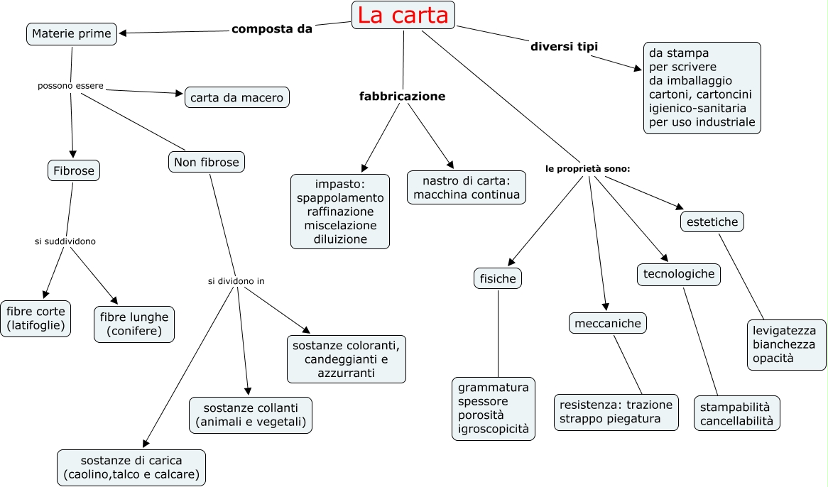 Questa Cmap, creata con IHMC CmapTools, contiene informazioni relative a: Carta, fisiche ???? grammatura spessore porosità igroscopicità, Non fibrose si dividono in sostanze di carica (caolino,talco e calcare), La carta diversi tipi da stampa per scrivere da imballaggio cartoni, cartoncini igienico-sanitaria per uso industriale, tecnologiche ???? stampabilità cancellabilità, La carta le proprietà sono: fisiche, Fibrose si suddividono fibre corte (latifoglie), estetiche ???? levigatezza bianchezza opacità, La carta composta da Materie prime, La carta le proprietà sono: tecnologiche, Materie prime possono essere Fibrose, meccaniche ???? resistenza: trazione strappo piegatura, Materie prime possono essere Non fibrose, La carta fabbricazione nastro di carta: macchina continua, La carta fabbricazione impasto: spappolamento raffinazione miscelazione diluizione, La carta le proprietà sono: meccaniche, Fibrose si suddividono fibre lunghe (conifere), La carta le proprietà sono: estetiche, Materie prime possono essere carta da macero, Non fibrose si dividono in sostanze coloranti, candeggianti e azzurranti, Non fibrose si dividono in sostanze collanti (animali e vegetali)