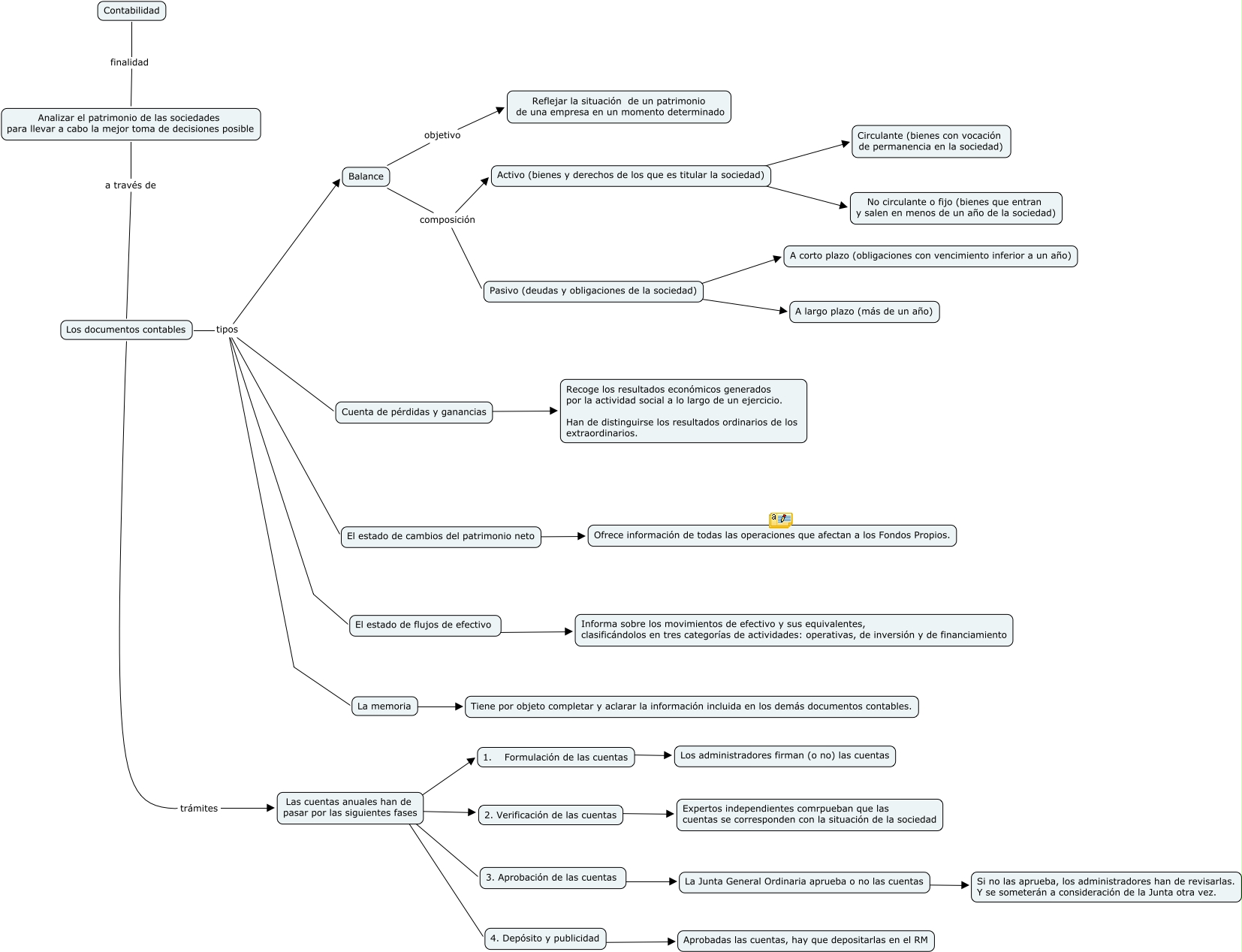 Este Cmap, tiene información relacionada con: Mercantil II - Caso 4, Los documentos contables trámites Las cuentas anuales han de pasar por las siguientes fases, Los documentos contables tipos El estado de cambios del patrimonio neto, La Junta General Ordinaria aprueba o no las cuentas ???? Si no las aprueba, los administradores han de revisarlas. Y se someterán a consideración de la Junta otra vez., Las cuentas anuales han de pasar por las siguientes fases ???? 1. Formulación de las cuentas, Las cuentas anuales han de pasar por las siguientes fases ???? 4. Depósito y publicidad, Contabilidad finalidad Analizar el patrimonio de las sociedades para llevar a cabo la mejor toma de decisiones posible, Las cuentas anuales han de pasar por las siguientes fases ???? 3. Aprobación de las cuentas, Pasivo (deudas y obligaciones de la sociedad) ???? A largo plazo (más de un año), Balance composición Pasivo (deudas y obligaciones de la sociedad), Balance objetivo Reflejar la situación de un patrimonio de una empresa en un momento determinado, Activo (bienes y derechos de los que es titular la sociedad) ???? Circulante (bienes con vocación de permanencia en la sociedad), El estado de flujos de efectivo ???? Informa sobre los movimientos de efectivo y sus equivalentes, clasificándolos en tres categorías de actividades: operativas, de inversión y de financiamiento, Los documentos contables tipos El estado de flujos de efectivo, Las cuentas anuales han de pasar por las siguientes fases ???? 2. Verificación de las cuentas, Pasivo (deudas y obligaciones de la sociedad) ???? A corto plazo (obligaciones con vencimiento inferior a un año), Los documentos contables tipos Cuenta de pérdidas y ganancias, Los documentos contables tipos Balance, La memoria ???? Tiene por objeto completar y aclarar la información incluida en los demás documentos contables., Activo (bienes y derechos de los que es titular la sociedad) ???? No circulante o fijo (bienes que entran y salen en menos de un año de la sociedad), Cuenta de pérdidas y ganancias ???? Recoge los resultados económicos generados por la actividad social a lo largo de un ejercicio. Han de distinguirse los resultados ordinarios de los extraordinarios.
