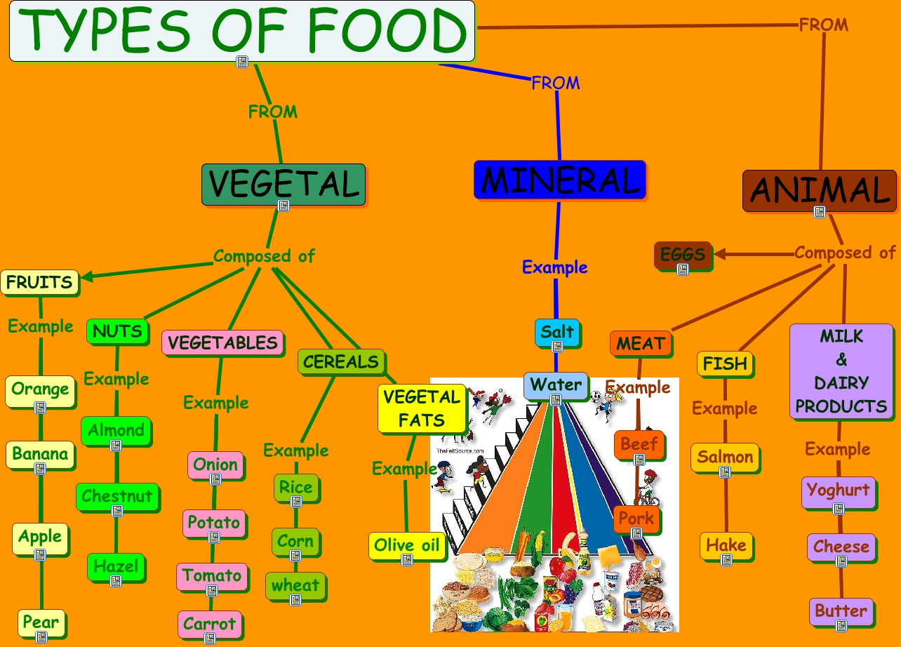 Este Cmap, tiene información relacionada con: Types Of Food, FRUITS Example Apple, CEREALS Example wheat, VEGETAL Composed of NUTS, VEGETAL FATS Example Olive oil, MEAT Example Beef, VEGETAL Composed of VEGETABLES, MILK & DAIRY PRODUCTS Example Butter, VEGETABLES Example Carrot, FRUITS Example Pear, TYPES OF FOOD FROM ANIMAL, ANIMAL Composed of FISH, TYPES OF FOOD FROM MINERAL, CEREALS Example Rice, TYPES OF FOOD FROM VEGETAL, NUTS Example Chestnut, MINERAL Example Salt, CEREALS Example Corn, ANIMAL Composed of MILK & DAIRY PRODUCTS, FISH Example Hake, VEGETAL Composed of FRUITS