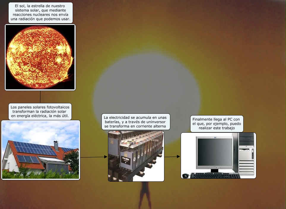 Este Cmap, tiene información relacionada con: JESUS_OSCAR_MOLINA_TRANSFORMACION_ENERGIA, ????, Los paneles solares fotovoltaicos transforman la radiación solar en energía eléctrica, la más útil. ????, El sol, la estrella de nuestro sistema solar, que mediante reacciones nucleares nos envía una radiación que podemos usar. ????, ???? Los paneles solares fotovoltaicos transforman la radiación solar en energía eléctrica, la más útil., ????, Finalmente llega al PC con el que, por ejemplo, puedo realizar este trabajo ????, La electricidad se acumula en unas baterías, y a través de uninversor se transforma en corriente alterna ????
