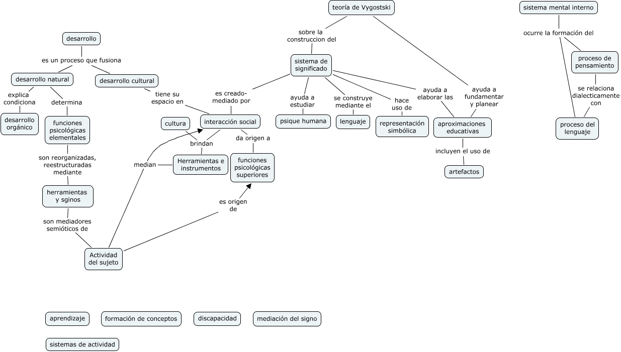 Este Cmap, tiene información relacionada con: Tecnologia y educacion especial, Herramientas e instrumentos median Actividad del sujeto, aproximaciones educativas incluyen el uso de artefactos, desarrollo es un proceso que fusiona desarrollo natural, interacción social da origen a funciones psicológicas superiores, desarrollo cultural tiene su espacio en interacción social, proceso de pensamiento se relaciona dialecticamente con proceso del lenguaje, interacción social brindan Herramientas e instrumentos, sistema de significado es creado- mediado por interacción social, teoría de Vygostski sobre la construccion del sistema de significado, herramientas y sginos son mediadores semióticos de Actividad del sujeto, sistema de significado ayuda a elaborar las aproximaciones educativas, sistema mental interno ocurre la formación del proceso del lenguaje, sistema de significado se construye mediante el lenguaje, Herramientas e instrumentos median interacción social, cultura brindan Herramientas e instrumentos, desarrollo natural determina funciones psicológicas elementales, desarrollo es un proceso que fusiona desarrollo cultural, funciones psicológicas elementales son reorganizadas, reestructuradas mediante herramientas y sginos, Actividad del sujeto es origen de funciones psicológicas superiores, desarrollo natural explica condiciona desarrollo orgánico