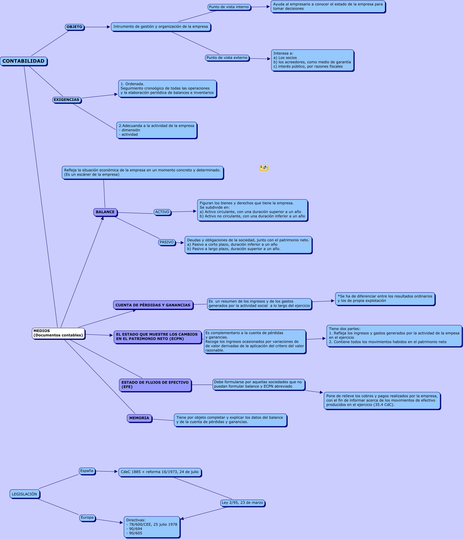 Este Cmap, tiene información relacionada con: MII- ESCENARI 4- Fent numeros, CONTABILIDAD EXIGENCIAS 1. Ordenada. Seguimiento cronoógico de todas las operaciones y la elaboración periódica de balances e inventarios, CONTABILIDAD OBJETO Intrumento de gestión y organización de la empresa, CONTABILIDAD MEDIOS (Documentos contables) MEMORIA, CONTABILIDAD EXIGENCIAS 2.Adecuanda a la actividad de la empresa - dimensión - actividad, BALANCE ???? Refleja la situación económica de la empresa en un momento concreto y determinado. (Es un escáner de la empresa), CONTABILIDAD MEDIOS (Documentos contables) CUENTA DE PÉRDIDAS Y GANANCIAS, CONTABILIDAD MEDIOS (Documentos contables) ESTADO DE FLUJOS DE EFECTIVO (EFE), CONTABILIDAD MEDIOS (Documentos contables) EL ESTADO QUE MUESTRE LOS CAMBIOS EN EL PATRIMONIO NETO (ECPN), Intrumento de gestión y organización de la empresa Punto de vista externo Interesa a: a) Los socios b) los acreedores, como medio de garantía c) interés público, por razones fiscales, LEGISLACIÓN Europa Directivas: - 78/600/CEE, 25 julio 1978 - 90/694 - 90/605, EL ESTADO QUE MUESTRE LOS CAMBIOS EN EL PATRIMONIO NETO (ECPN) Es complementario a la cuenta de pérdidas y ganancias. Recoge los ingresos ocasionados por variaciones de de valor derivadas de la aplicación del critero del valor razonable. Tiene dos partes: 1. Refleja los ingresos y gastos generados por la actividad de la empesa en el ejercicio 2. Contiene todos los movimientos habidos en el patrimonio neto, ESTADO DE FLUJOS DE EFECTIVO (EFE) Debe formularse por aquellas sociedades que no puedan formular balance y ECPN abreviado Pone de relieve los cobros y pagos realizados por la empresa, con el fin de informar acerca de los movimientos de efectivo producidos en el ejercicio (35.4 CdC)., CdeC 1885 + reforma 16/1973, 24 de julio Ley 2/95, 23 de marzo Directivas: - 78/600/CEE, 25 julio 1978 - 90/694 - 90/605, CONTABILIDAD MEDIOS (Documentos contables) BALANCE, CUENTA DE PÉRDIDAS Y GANANCIAS Es un resumen de los ingresos y de los gastos generados por la actividad social a lo largo del ejercicio *Se ha de diferenciar entre los resultados ordinarios y los de propia explotación, LEGISLACIÓN España CdeC 1885 + reforma 16/1973, 24 de julio, BALANCE ACTIVO Figuran los bienes y derechos que tiene la empresa. Se subdivide en: a) Activo circulante, con una duración superior a un año b) Activo no circulante, con una duración inferior a un año, MEMORIA ???? Tiene por objeto completar y explicar los datos del balance y de la cuenta de pérdidas y ganancias., Intrumento de gestión y organización de la empresa Punto de vista interno Ayuda al empresario a conocer el estado de la empresa para tomar decisiones, BALANCE PASIVO Deudas y obligaciones de la sociedad, junto con el patrimonio neto. a) Pasivo a corto plazo, duración inferior a un año b) Pasivo a largo plazo, duración superior a un año.