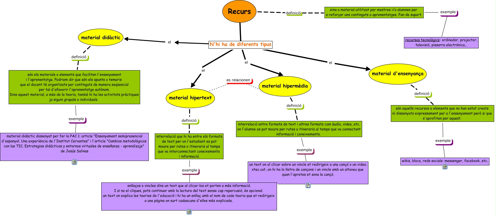 Este Cmap, tiene información relacionada con: recursos hipermèdia, Recurs ???? N'hi ha de diferents tipus, interrelació que hi ha entre els formats de text per on l'estudiant es pot moure per rutes o itineraris al temps que va interconnectant coneixements i informació. exemple enllaços o vincles dins un text que al clicar-los et porten a més informació. I si no el cliques, pots continuar amb la lectura del text sense cap repercusió, és opcional. un text on explica les teories de l'educació i hi ha un enllaç amb el nom de cada teoria que et redirigeix a una pàgina on surt cadascuna d'elles més explicada., material hipertext es relacionen material hipermèdia, material hipermèdia definició interrelació entre formats de text i altres formats com àudio, video, etc. on l'alumne es pot moure per rutes o itineraris al temps que va connectant informació i coneixements., Recurs definició eina o material utilitzat per mestres i/o alumnes per a reforçar uns continguts o aprenentatges. Fan de suport., material hipertext definició interrelació que hi ha entre els formats de text per on l'estudiant es pot moure per rutes o itineraris al temps que va interconnectant coneixements i informació., N'hi ha de diferents tipus el material hipermèdia, N'hi ha de diferents tipus el material hipertext, material didàctic definició són els materials o elements que faciliten l'ensenyament i l'aprenentatge. Podriem dir que són els apunts o temaris que el docent té organitzats per continguts de manera seqüencial per tal d'afavorir l'aprenentatge autònom. Dins aquest material, a més de la teoria, també hi ha les activitats pràctiques ja siguin grupals o individuals., són aquells recursos o elements que no han estat creats ni dissenyats expressament per a l'ensenyament però si que s'aprofiten per aquest. exemple wikis, blocs, reds socials: messenger, facebook, etc., interrelació entre formats de text i altres formats com àudio, video, etc. on l'alumne es pot moure per rutes o itineraris al temps que va connectant informació i coneixements. exemple un text on al clicar sobre un vincle et redirigeix a una cançó o un video. xtec.cat, on hi ha la lletra de cançons i un vincle amb un altaveu que quan l'apretes et sona la cançó., eina o material utilitzat per mestres i/o alumnes per a reforçar uns continguts o aprenentatges. Fan de suport. exemple recursos tecnològics: ordinador, projector, televisió, pissarra electrònica..., material d'ensenyança definició són aquells recursos o elements que no han estat creats ni dissenyats expressament per a l'ensenyament però si que s'aprofiten per aquest., N'hi ha de diferents tipus el material d'ensenyança, són els materials o elements que faciliten l'ensenyament i l'aprenentatge. Podriem dir que són els apunts o temaris que el docent té organitzats per continguts de manera seqüencial per tal d'afavorir l'aprenentatge autònom. Dins aquest material, a més de la teoria, també hi ha les activitats pràctiques ja siguin grupals o individuals. exemple material didàctic dissenyat per fer la PAC 1: article "Ensenyament semipresencial d'espanyol. Una experiència de l'Institut Cervantes" i l'article "Cambios metodològicos con las TIC. Estrategias didácticas y entornos virtuales de enseñanza - aprendizaje" de Jesús Salinas, N'hi ha de diferents tipus el material didàctic