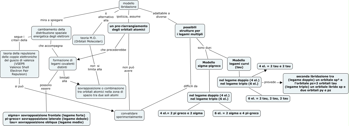 Questa Cmap, creata con IHMC CmapTools, contiene informazioni relative a: ibridazione_sk, un pre-riarrangiamento degli orbitali atomici che precederebbe formazione di legami covalenti distinti, possibili strutture per i legami multipli sono due: Modello sigma-pigreco, modello ibridazione ipotizza, assume un pre-riarrangiamento degli orbitali atomici, nel legame doppio (4 el.) nel legame triplo (6 el.) 4 el. = 2 tau e 2 tau, possibili strutture per i legami multipli difficili da convalidare sperimentalmente, modello ibridazione adattabile a diverse possibili strutture per i legami multipli, nel legame doppio (4 el.) nel legame triplo (6 el.) prevede seconda ibridazione tra (legame doppio) un orbitale sp² e l'orbitale pz=2 orbitali tau (legame triplo) un orbitale ibrido sp e due orbitali py e pz, nel legame doppio (4 el.) nel legame triplo (6 el.) 6 el. = 2 sigma e 4 pi-greco, cambiamento della distribuzione spaziale energetica degli elettroni che accompagna formazione di legami covalenti distinti, teoria della repulsione delle coppie elettroniche del guscio di valenza (VSEPR Valence Shell Electron Pair Repulsion) si può convalidare sperimentalmente, teoria M.O. (Orbitali Molecolari) non si limita alla sovrapposizione o combinazione tra orbitali atomici nella zona di spazio tra due soli atomi, possibili strutture per i legami multipli sono due: Modello legami curvi (tau), modello ibridazione mira a spiegare cambiamento della distribuzione spaziale energetica degli elettroni, modello ibridazione è alternativo alla teoria M.O. (Orbitali Molecolari), nel legame doppio (4 el.) nel legame triplo (6 el.) 6 el. = 2 tau, 2 tau, 2 tau, nel legame doppio (4 el.) nel legame triplo (6 el.) 4 el.= 2 pi greco e 2 sigma, formazione di legami covalenti distinti limitati alla sovrapposizione o combinazione tra orbitali atomici nella zona di spazio tra due soli atomi, Modello sigma-pigreco nel legame doppio (4 el.) nel legame triplo (6 el.), cambiamento della distribuzione spaziale energetica degli elettroni segue i criteri della teoria della repulsione delle coppie elettroniche del guscio di valenza (VSEPR Valence Shell Electron Pair Repulsion), Modello legami curvi (tau) nel legame doppio (4 el.) nel legame triplo (6 el.)