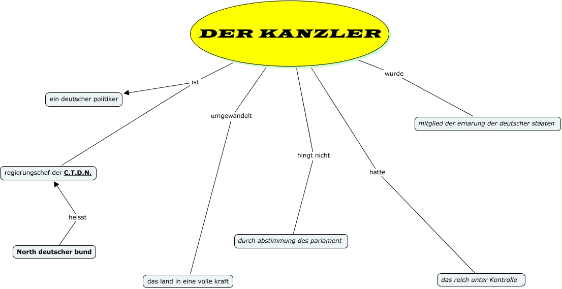 Questa Cmap, creata con IHMC CmapTools, contiene informazioni relative a: der kanzler, DER KANZLER hatte das reich unter Kontrolle, DER KANZLER hingt nicht durch abstimmung des parlament, DER KANZLER umgewandelt das land in eine volle kraft, DER KANZLER wurde mitglied der ernarung der deutscher staaten, DER KANZLER ist ein deutscher politiker, DER KANZLER ist regierungschef der C.T.D.N., North deutscher bund heisst regierungschef der C.T.D.N.