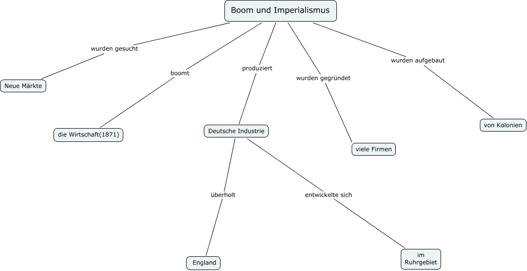 Questa Cmap, creata con IHMC CmapTools, contiene informazioni relative a: Boom und Imperialismus(1), Deutsche Industrie überholt England, Boom und Imperialismus produziert Deutsche Industrie, Deutsche Industrie entwickelte sich im Ruhrgebiet, Boom und Imperialismus wurden gegründet viele Firmen, Boom und Imperialismus wurden aufgebaut von Kolonien, Boom und Imperialismus wurden gesucht Neue Märkte, Boom und Imperialismus boomt die Wirtschaft(1871)