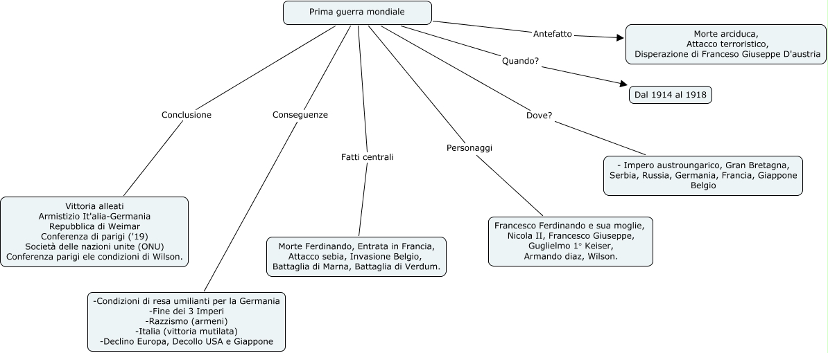 Questa Cmap, creata con IHMC CmapTools, contiene informazioni relative a: Prima guerra mondiale, Prima guerra mondiale Conclusione Vittoria alleati Armistizio It'alia-Germania Repubblica di Weimar Conferenza di parigi ('19) Società delle nazioni unite (ONU) Conferenza parigi ele condizioni di Wilson., Prima guerra mondiale Dove? - Impero austroungarico, Gran Bretagna, Serbia, Russia, Germania, Francia, Giappone Belgio, Prima guerra mondiale Conseguenze -Condizioni di resa umilianti per la Germania -Fine dei 3 Imperi -Razzismo (armeni) -Italia (vittoria mutilata) -Declino Europa, Decollo USA e Giappone, Prima guerra mondiale Antefatto Morte arciduca, Attacco terroristico, Disperazione di Franceso Giuseppe D'austria, Prima guerra mondiale Personaggi Francesco Ferdinando e sua moglie, Nicola II, Francesco Giuseppe, Guglielmo 1° Keiser, Armando diaz, Wilson., Prima guerra mondiale Fatti centrali Morte Ferdinando, Entrata in Francia, Attacco sebia, Invasione Belgio, Battaglia di Marna, Battaglia di Verdum., Prima guerra mondiale Quando? Dal 1914 al 1918