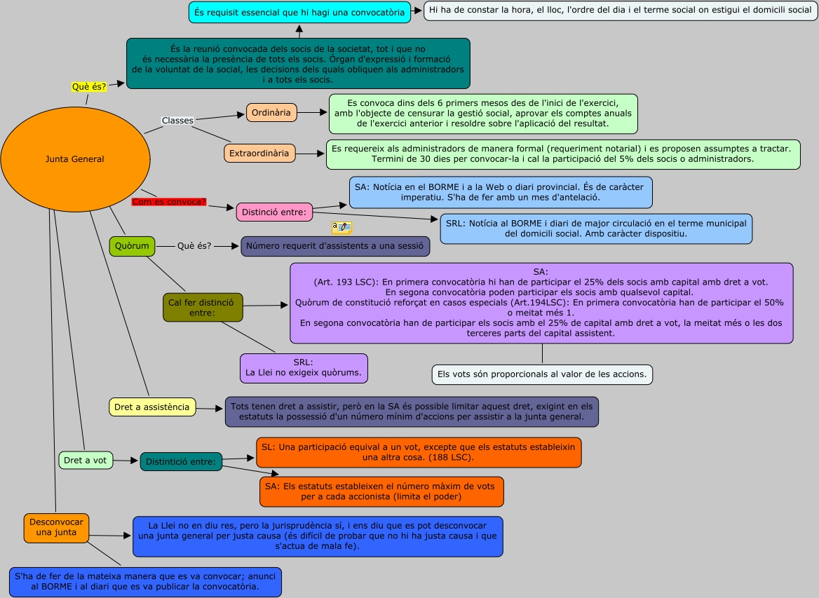 Este Cmap, tiene información relacionada con: escenari5, Extraordinària ???? Es requereix als administradors de manera formal (requeriment notarial) i es proposen assumptes a tractar. Termini de 30 dies per convocar-la i cal la participació del 5% dels socis o administradors., Ordinària ???? Es convoca dins dels 6 primers mesos des de l'inici de l'exercici, amb l'objecte de censurar la gestió social, aprovar els comptes anuals de l'exercici anterior i resoldre sobre l'aplicació del resultat., Distintició entre: ???? SA: Els estatuts estableixen el número màxim de vots per a cada accionista (limita el poder), Quòrum Què és? Número requerit d'assistents a una sessió, Junta General Classes Ordinària, Junta General Classes Extraordinària, Quòrum ???? Cal fer distinció entre:, Distinció entre: ???? SA: Notícia en el BORME i a la Web o diari provincial. És de caràcter imperatiu. S'ha de fer amb un mes d'antelació., Cal fer distinció entre: ???? SRL: La Llei no exigeix quòrums., És requisit essencial que hi hagi una convocatòria ???? Hi ha de constar la hora, el lloc, l'ordre del dia i el terme social on estigui el domicili social, Distinció entre: ???? SRL: Notícia al BORME i diari de major circulació en el terme municipal del domicili social. Amb caràcter dispositiu., Junta General Com es convoca? Distinció entre:, Desconvocar una junta ???? La Llei no en diu res, pero la jurisprudència sí, i ens diu que es pot desconvocar una junta general per justa causa (és difícil de probar que no hi ha justa causa i que s'actua de mala fe)., Dret a vot ???? Distintició entre:, Junta General Què és? És la reunió convocada dels socis de la societat, tot i que no és necessària la presència de tots els socis. Órgan d'expressió i formació de la voluntat de la social, les decisions dels quals obliquen als administradors i a tots els socis., Distintició entre: ???? SL: Una participació equival a un vot, excepte que els estatuts estableixin una altra cosa. (188 LSC)., Junta General ???? Desconvocar una junta, Junta General ???? Dret a vot, Junta General ???? Dret a assistència, SA: (Art. 193 LSC): En primera convocatòria hi han de participar el 25% dels socis amb capital amb dret a vot. En segona convocatòria poden participar els socis amb qualsevol capital. Quòrum de constitució reforçat en casos especials (Art.194LSC): En primera convocatòria han de participar el 50% o meitat més 1. En segona convocatòria han de participar els socis amb el 25% de capital amb dret a vot, la meitat més o les dos terceres parts del capital assistent. ???? Els vots són proporcionals al valor de les accions.