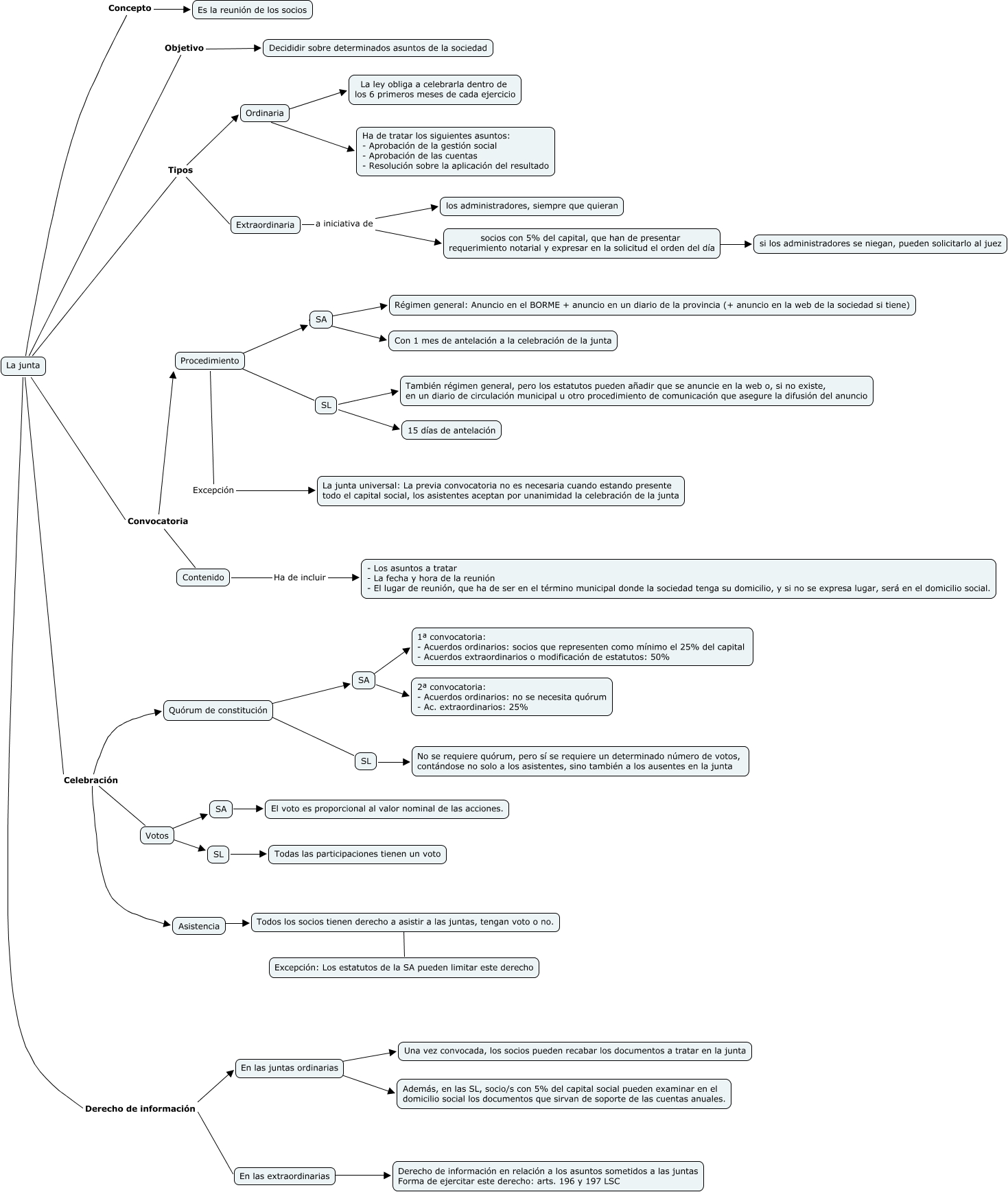 Este Cmap, tiene información relacionada con: Mercantil II - Caso 5, Procedimiento ???? SA, La junta Derecho de información En las juntas ordinarias, La junta Convocatoria Procedimiento, La junta Derecho de información En las extraordinarias, Ordinaria ???? Ha de tratar los siguientes asuntos: - Aprobación de la gestión social - Aprobación de las cuentas - Resolución sobre la aplicación del resultado, socios con 5% del capital, que han de presentar requerimiento notarial y expresar en la solicitud el orden del día ???? si los administradores se niegan, pueden solicitarlo al juez, SA ???? 2ª convocatoria: - Acuerdos ordinarios: no se necesita quórum - Ac. extraordinarios: 25%, Procedimiento Excepción La junta universal: La previa convocatoria no es necesaria cuando estando presente todo el capital social, los asistentes aceptan por unanimidad la celebración de la junta, Quórum de constitución ???? SA, La junta Concepto Es la reunión de los socios, Asistencia ???? Todos los socios tienen derecho a asistir a las juntas, tengan voto o no., Votos ???? SL, En las juntas ordinarias ???? Además, en las SL, socio/s con 5% del capital social pueden examinar en el domicilio social los documentos que sirvan de soporte de las cuentas anuales., Ordinaria ???? La ley obliga a celebrarla dentro de los 6 primeros meses de cada ejercicio, Extraordinaria a iniciativa de socios con 5% del capital, que han de presentar requerimiento notarial y expresar en la solicitud el orden del día, SL ???? Todas las participaciones tienen un voto, Extraordinaria a iniciativa de los administradores, siempre que quieran, SA ???? Régimen general: Anuncio en el BORME + anuncio en un diario de la provincia (+ anuncio en la web de la sociedad si tiene), Contenido Ha de incluir - Los asuntos a tratar - La fecha y hora de la reunión - El lugar de reunión, que ha de ser en el término municipal donde la sociedad tenga su domicilio, y si no se expresa lugar, será en el domicilio social., La junta Convocatoria Contenido