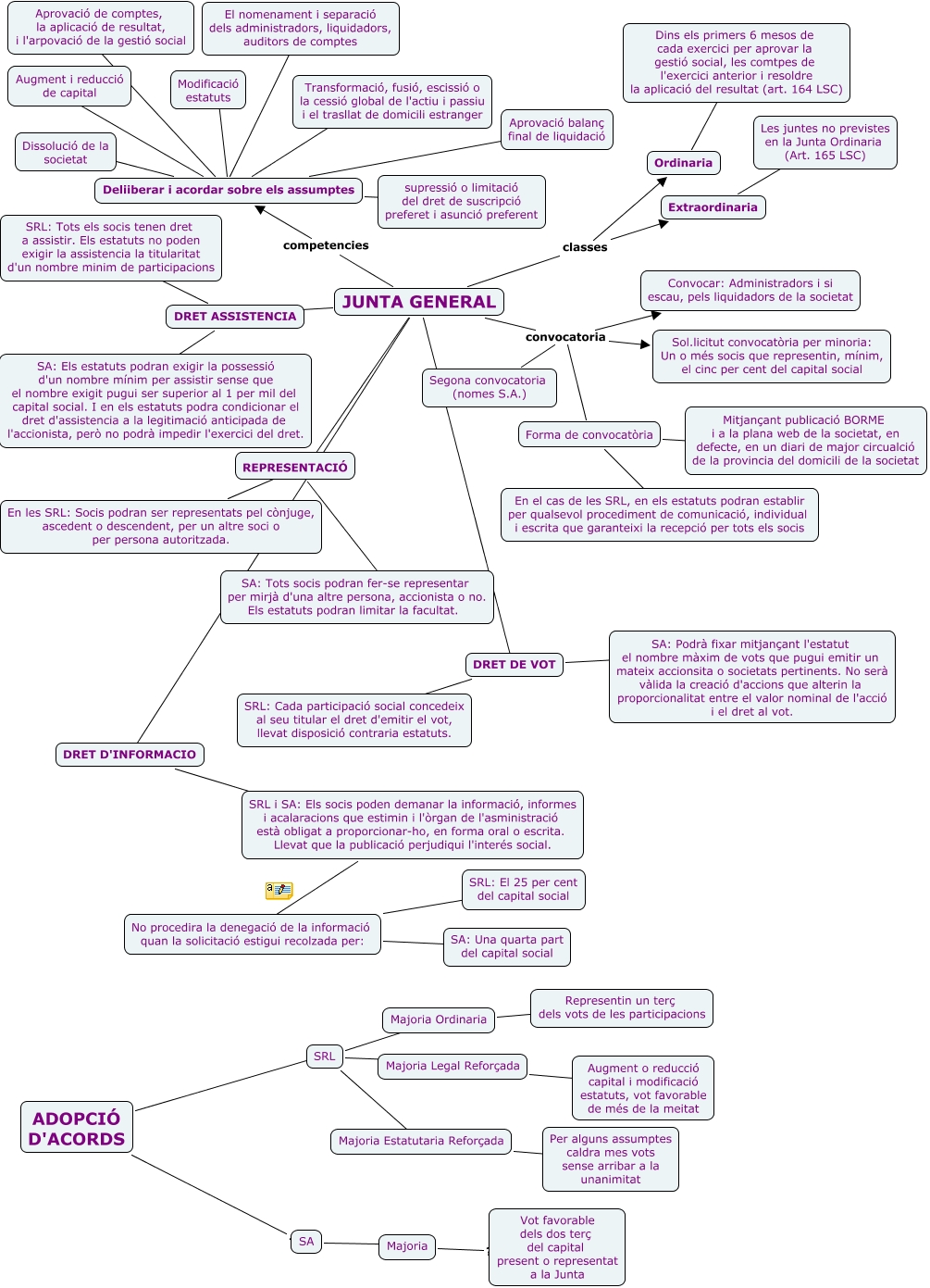 Este Cmap, tiene información relacionada con: Junta General, ADOPCIÓ D'ACORDS ???? SA, JUNTA GENERAL ???? DRET DE VOT, REPRESENTACIÓ ???? SA: Tots socis podran fer-se representar per mirjà d'una altre persona, accionista o no. Els estatuts podran limitar la facultat., SA ???? Majoria, DRET ASSISTENCIA ???? SRL: Tots els socis tenen dret a assistir. Els estatuts no poden exigir la assistencia la titularitat d'un nombre minim de participacions, Forma de convocatòria ???? En el cas de les SRL, en els estatuts podran establir per qualsevol procediment de comunicació, individual i escrita que garanteixi la recepció per tots els socis, JUNTA GENERAL classes Ordinaria, JUNTA GENERAL competencies Deliiberar i acordar sobre els assumptes, JUNTA GENERAL convocatoria Segona convocatoria (nomes S.A.), SRL ???? Majoria Legal Reforçada, ADOPCIÓ D'ACORDS ???? SRL, Majoria ???? Vot favorable dels dos terç del capital present o representat a la Junta, Deliiberar i acordar sobre els assumptes ???? Modificació estatuts, No procedira la denegació de la informació quan la solicitació estigui recolzada per: ???? SRL: El 25 per cent del capital social, DRET DE VOT ???? SA: Podrà fixar mitjançant l'estatut el nombre màxim de vots que pugui emitir un mateix accionsita o societats pertinents. No serà vàlida la creació d'accions que alterin la proporcionalitat entre el valor nominal de l'acció i el dret al vot., SRL ???? Majoria Ordinaria, No procedira la denegació de la informació quan la solicitació estigui recolzada per: ???? SA: Una quarta part del capital social, JUNTA GENERAL ???? En les SRL: Socis podran ser representats pel cònjuge, ascedent o descendent, per un altre soci o per persona autoritzada., JUNTA GENERAL ???? DRET ASSISTENCIA, JUNTA GENERAL ???? REPRESENTACIÓ