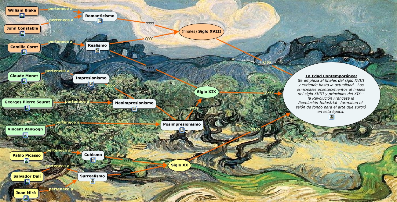 This Concept Map, created with IHMC CmapTools, has information related to: Arte1.cmap, Impresionismo ???? Neoimpresionismo, Pablo Picasso pertenece a Cubismo, Realismo ???? (finales) Siglo XVIII, William Blake pertenece a Romanticismo, (finales) Siglo XVIII ???? La Edad Contemporánea: Se empieza al finales del siglo XVIII y extiende hasta la actualidad. Los principales acontecimientos al finales del siglo XVIII y princípios del XIX-- la Revolución Francesa la Revolución Industrial--formaban el telón de fondo para el arte que surgió en esta época., Georges Pierre Seurat pertenece a Neoimpresionismo, Posimpresionismo ???? Siglo XIX, Claude Monet pertenece a Impresionismo, Realismo ???? Siglo XIX, Romanticismo ???? (finales) Siglo XVIII, Vincent VanGogh pertenece a Posimpresionismo, Cubismo ???? Siglo XX, John Constable pertenece a Romanticismo, Salvador Dalí pertenece a Surrealismo, Siglo XIX ???? La Edad Contemporánea: Se empieza al finales del siglo XVIII y extiende hasta la actualidad. Los principales acontecimientos al finales del siglo XVIII y princípios del XIX-- la Revolución Francesa la Revolución Industrial--formaban el telón de fondo para el arte que surgió en esta época., Joan Miró pertenece a Surrealismo, Siglo XX ???? La Edad Contemporánea: Se empieza al finales del siglo XVIII y extiende hasta la actualidad. Los principales acontecimientos al finales del siglo XVIII y princípios del XIX-- la Revolución Francesa la Revolución Industrial--formaban el telón de fondo para el arte que surgió en esta época., Neoimpresionismo ???? Posimpresionismo, Surrealismo ???? Siglo XX, Camille Corot pertenece a Realismo
